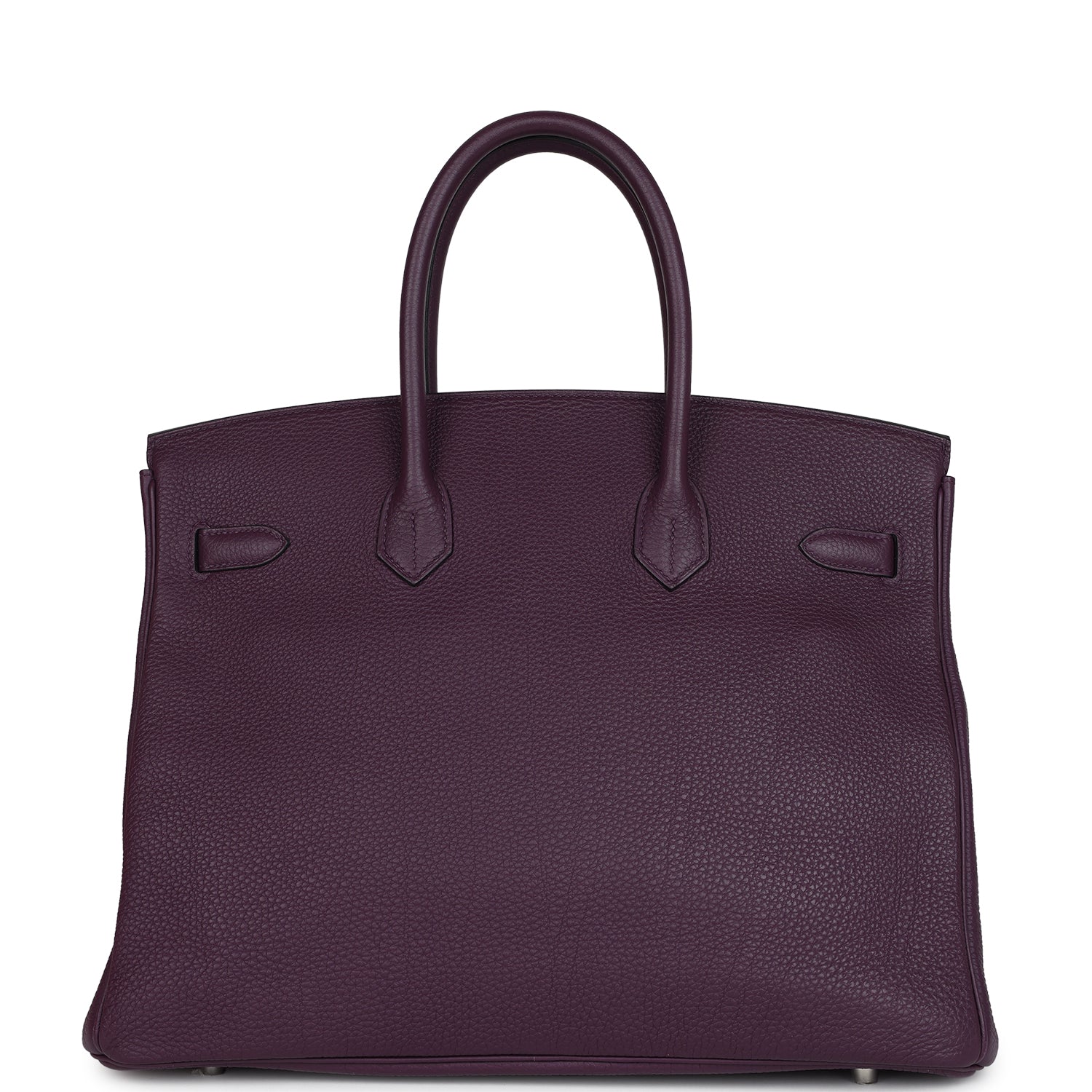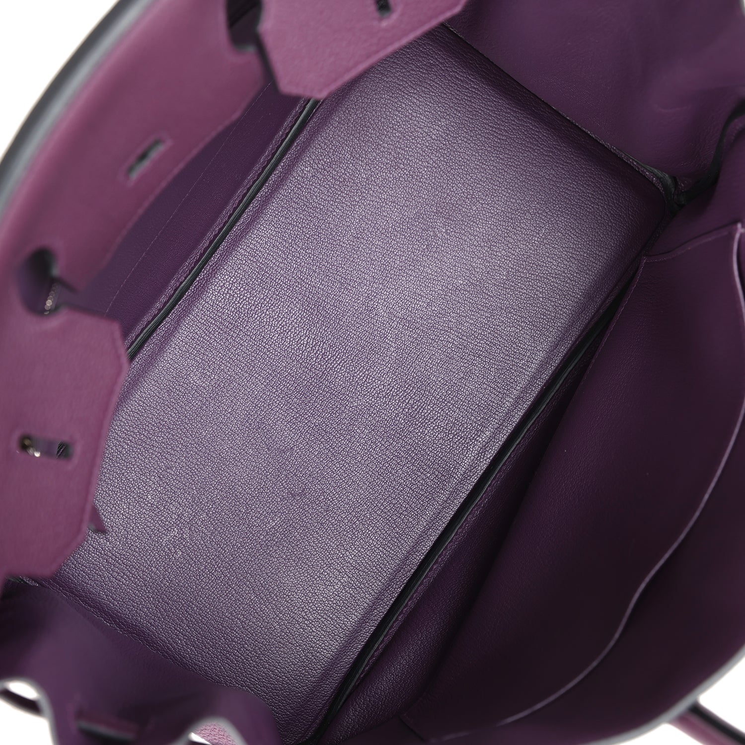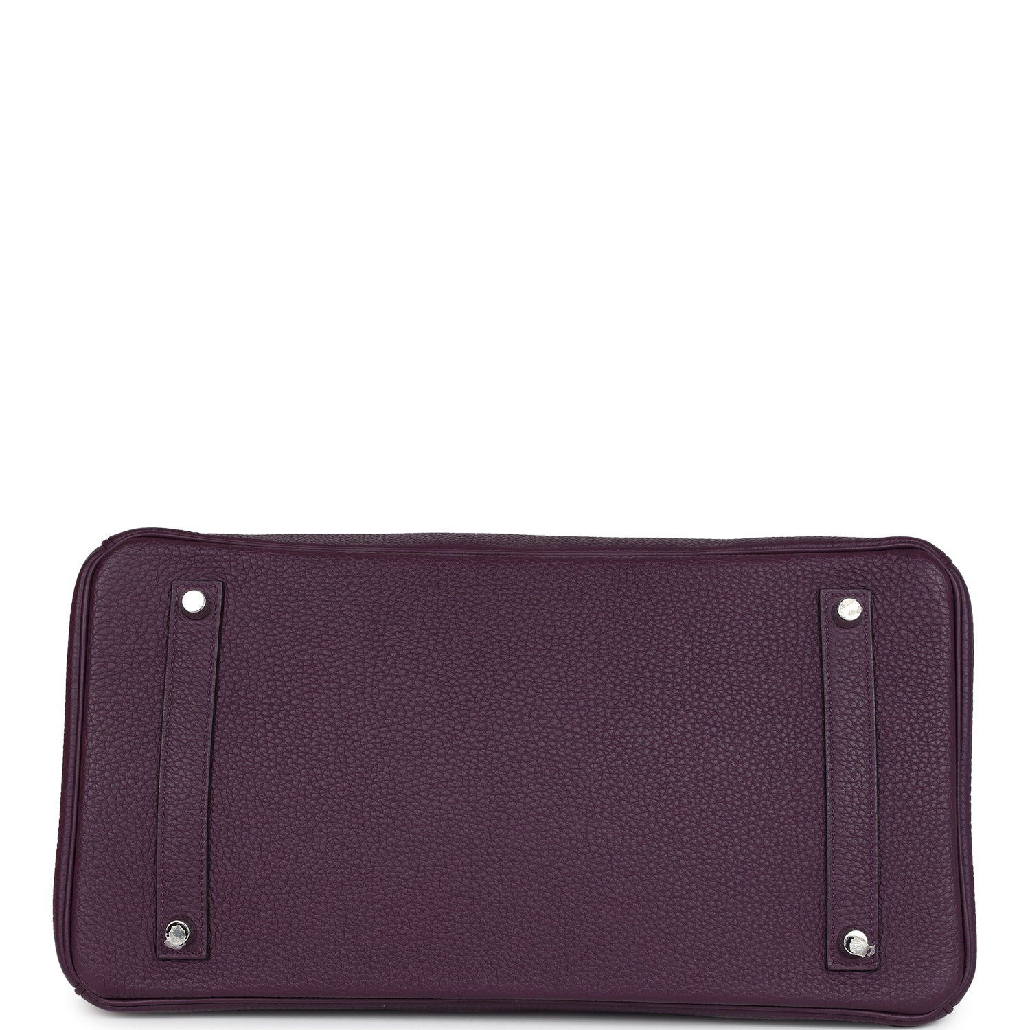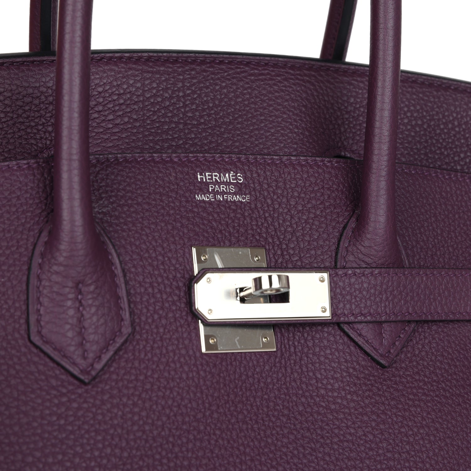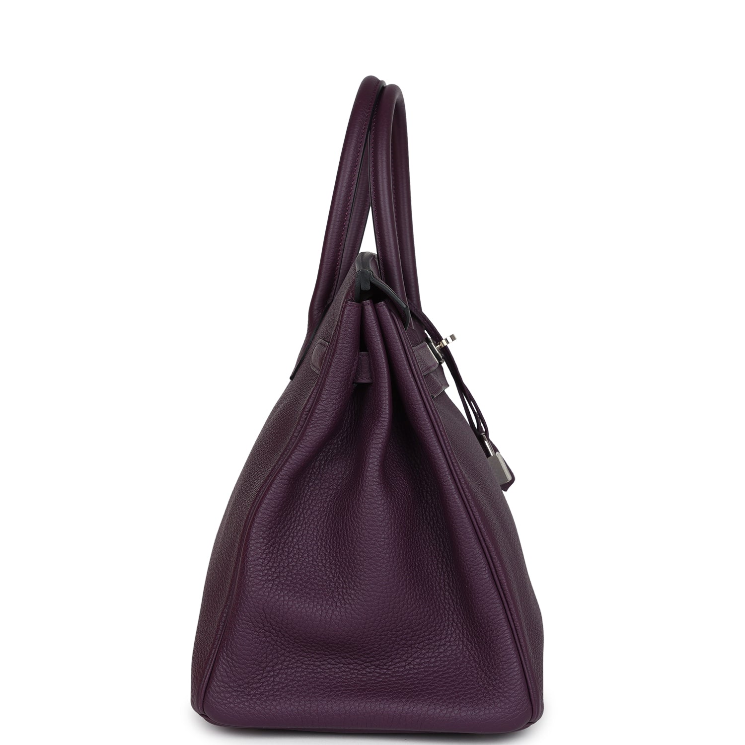 This Birkin is in Cassis togo leather with palladium hardware and has tonal stitching, front flap, two straps with center toggle closure, clochette with lock and two keys, and double rolled handles.