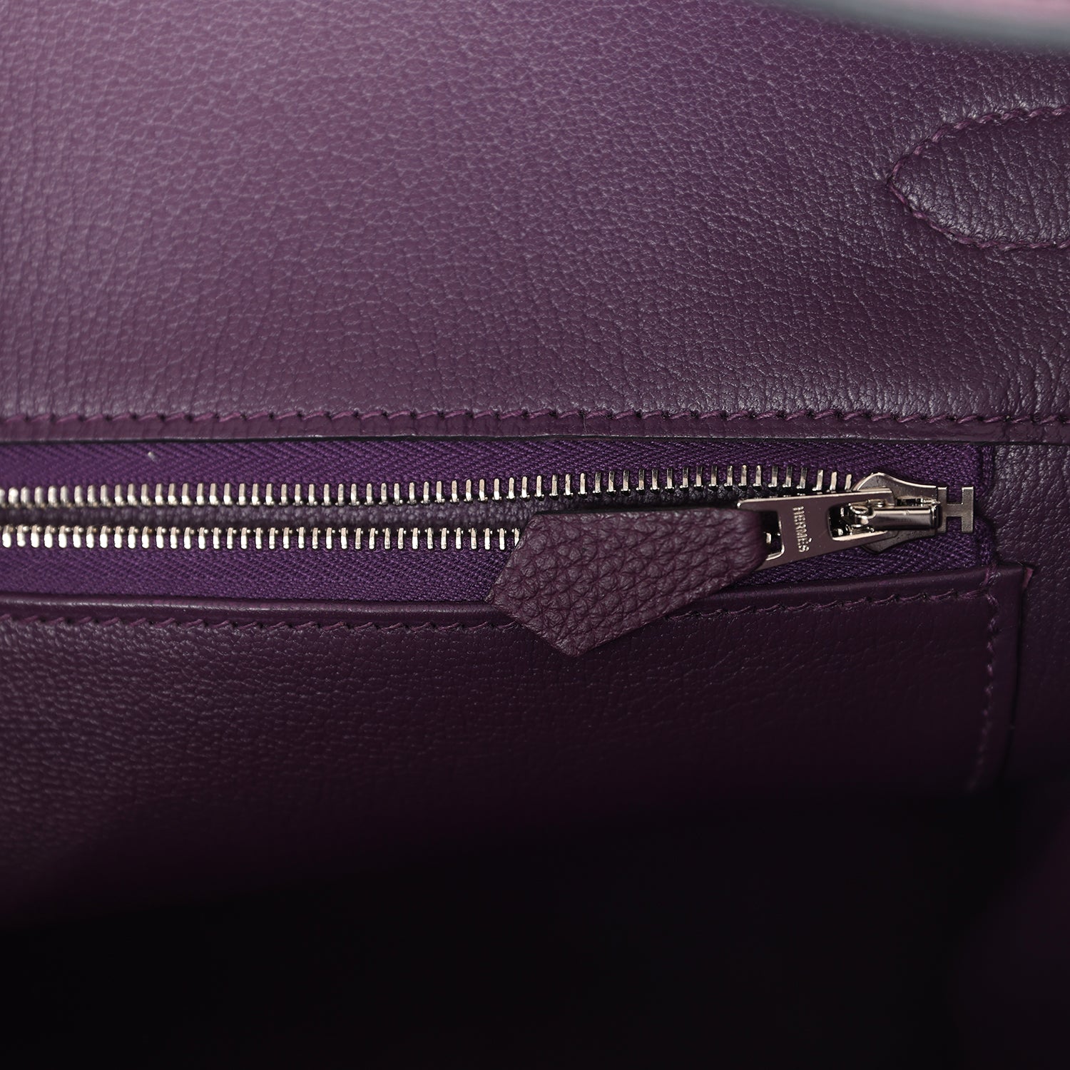 The interior is lined with Cassis chevre and has one zip pocket with an Hermes engraved zipper pull and an open pocket on the opposite side.