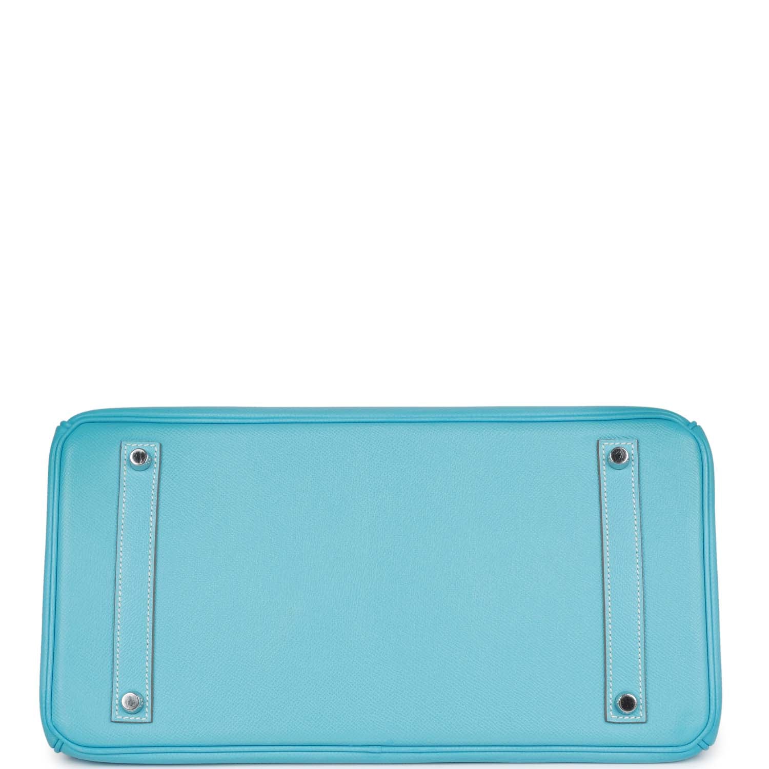 This Candy Birkin is in Celeste epsom leather with palladium hardware and has contrast stitching, a front toggle closure, a clochette with lock and two keys, and double rolled handles.