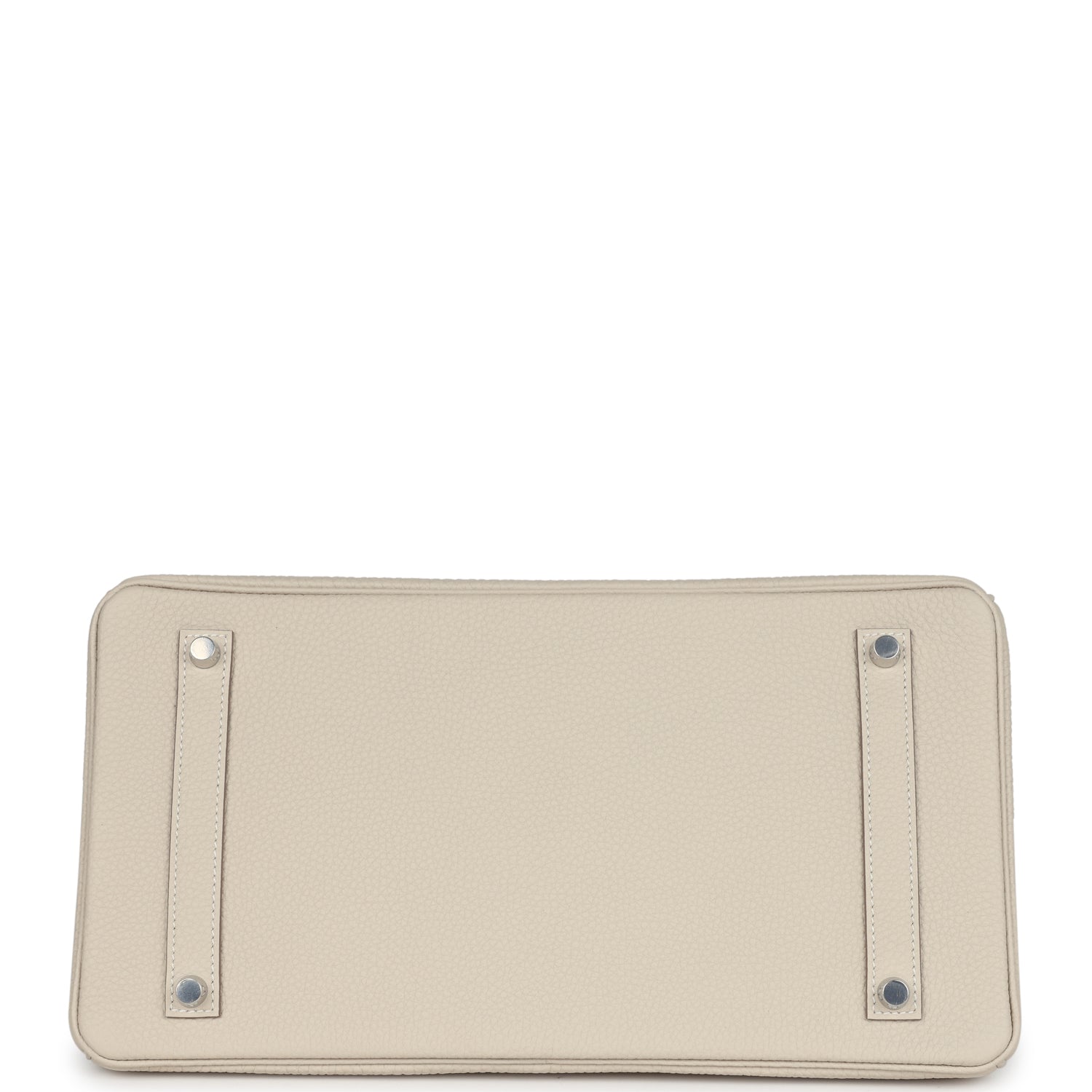 This Birkin is in Craie togo leather with palladium hardware and has tonal stitching, front flap, two straps with center toggle closure, clochette with lock and two keys, and double rolled handles.