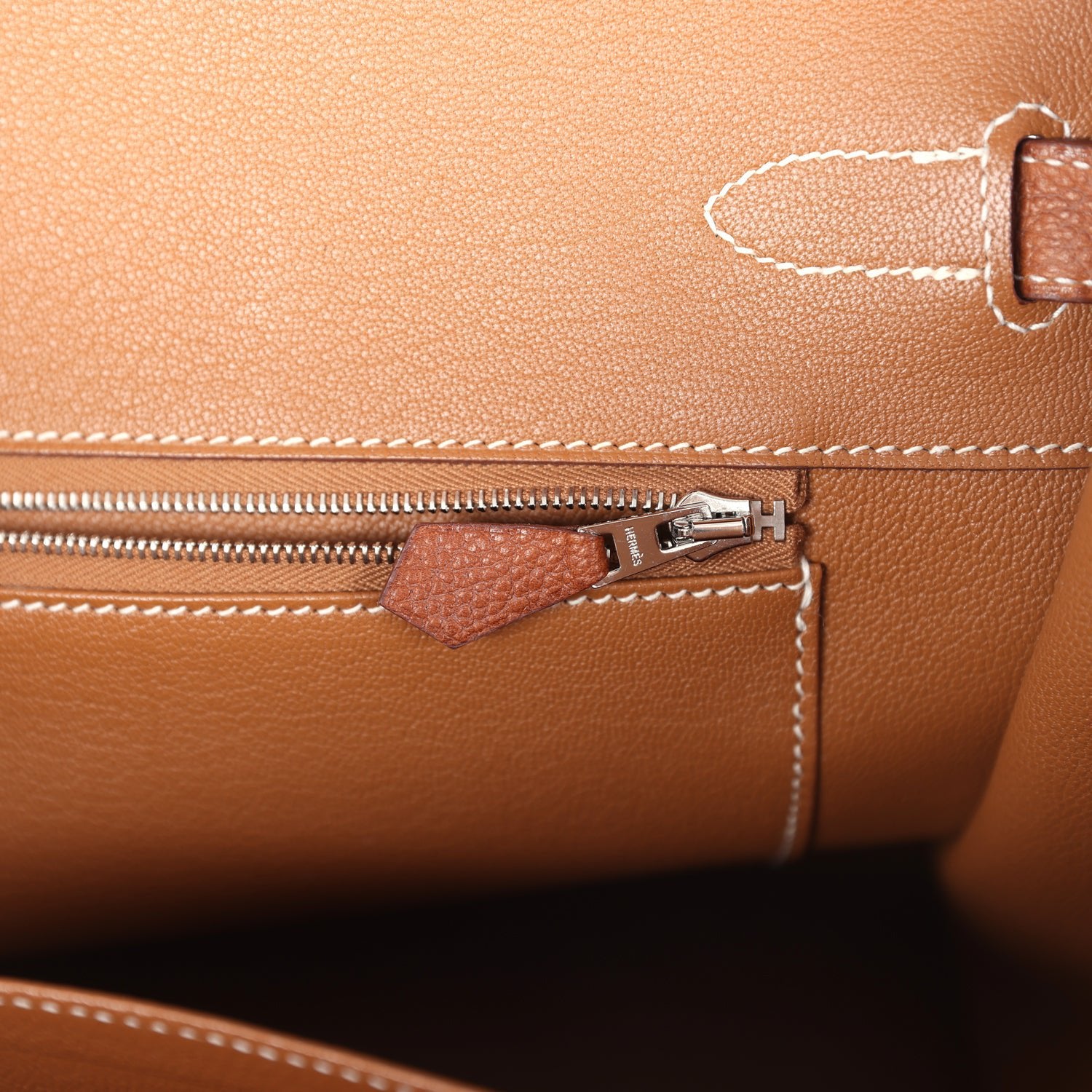 The interior is lined with Fauve chevre and has one zip pocket with an Hermes engraved zipper pull and an open pocket on the opposite side.