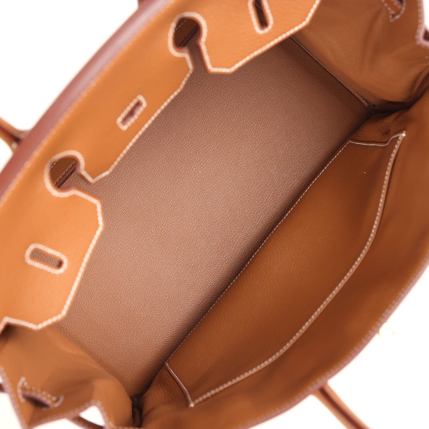 The interior is lined with Gold chevre and has one zip pocket with an Hermes engraved zipper pull and an open pocket on the opposite side.