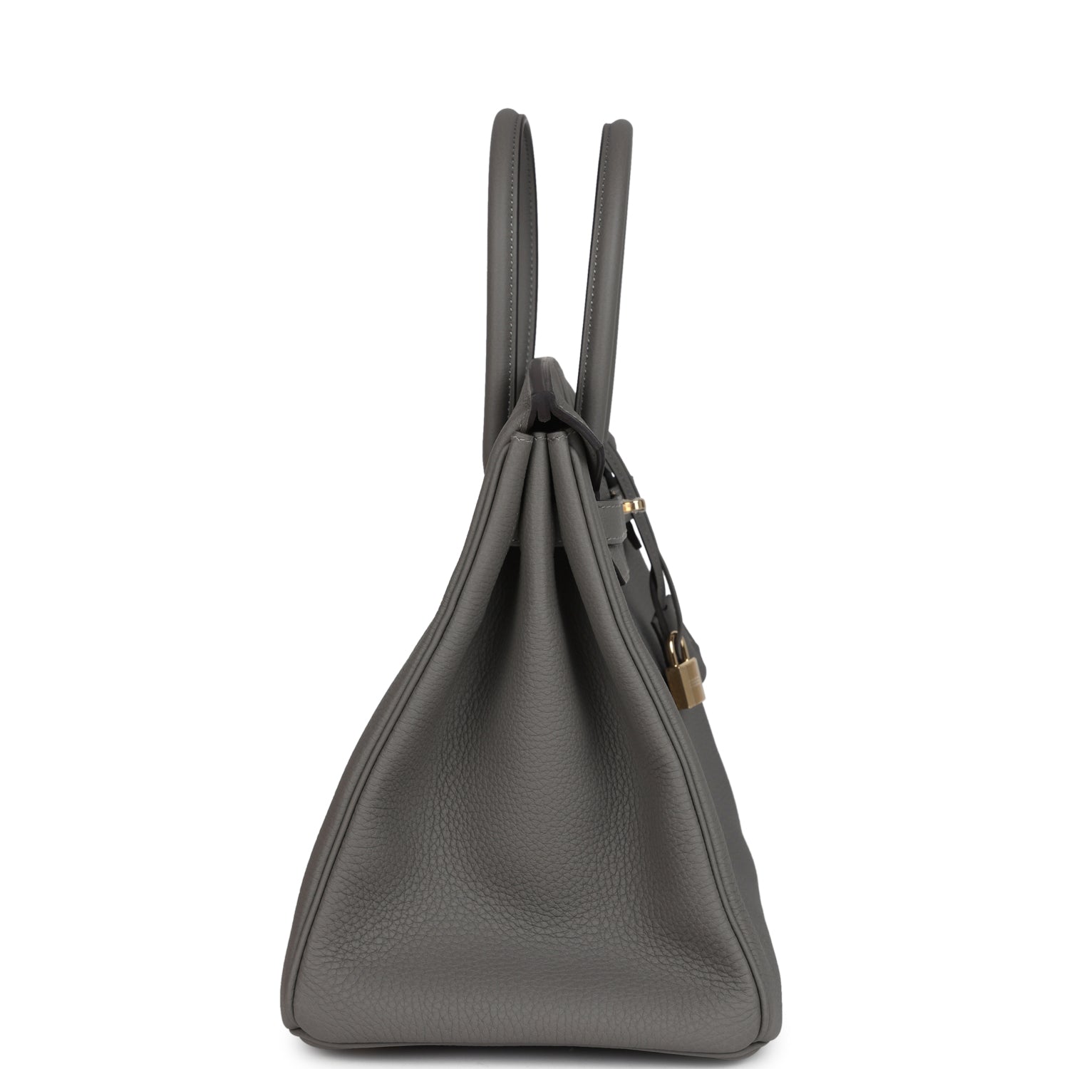 This Birkin is in Gris Meyer togo leather with permabrass hardware and has tonal stitching, front flap, two straps with center toggle closure, clochette with lock and two keys, and double rolled handles.