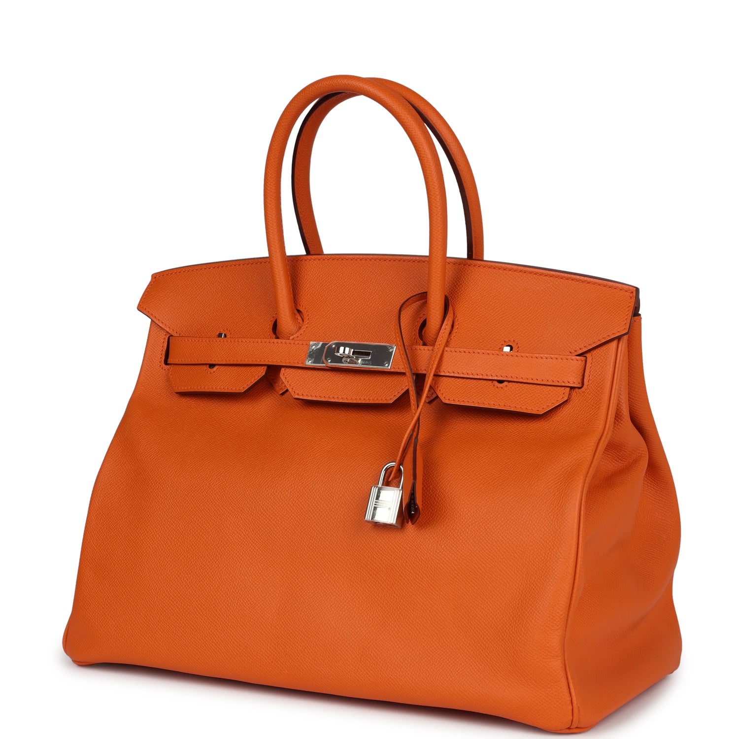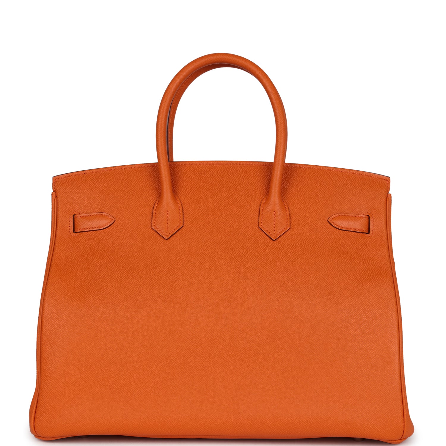 Birkin is in Orange epsom leather with palladium hardware and has tonal stitching, front flap, two straps with center toggle closure, clochette with lock and two keys, and double rolled handles.
