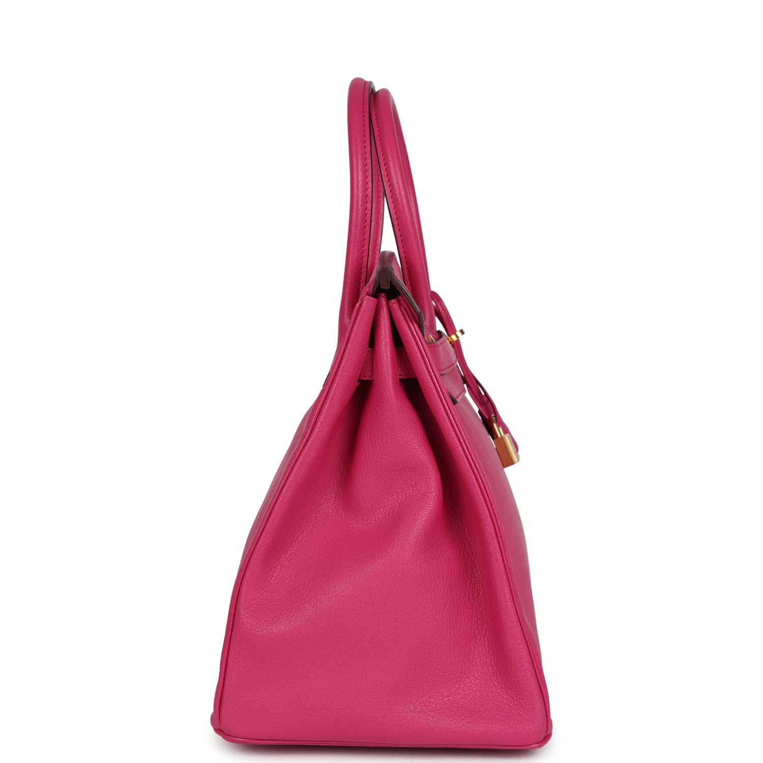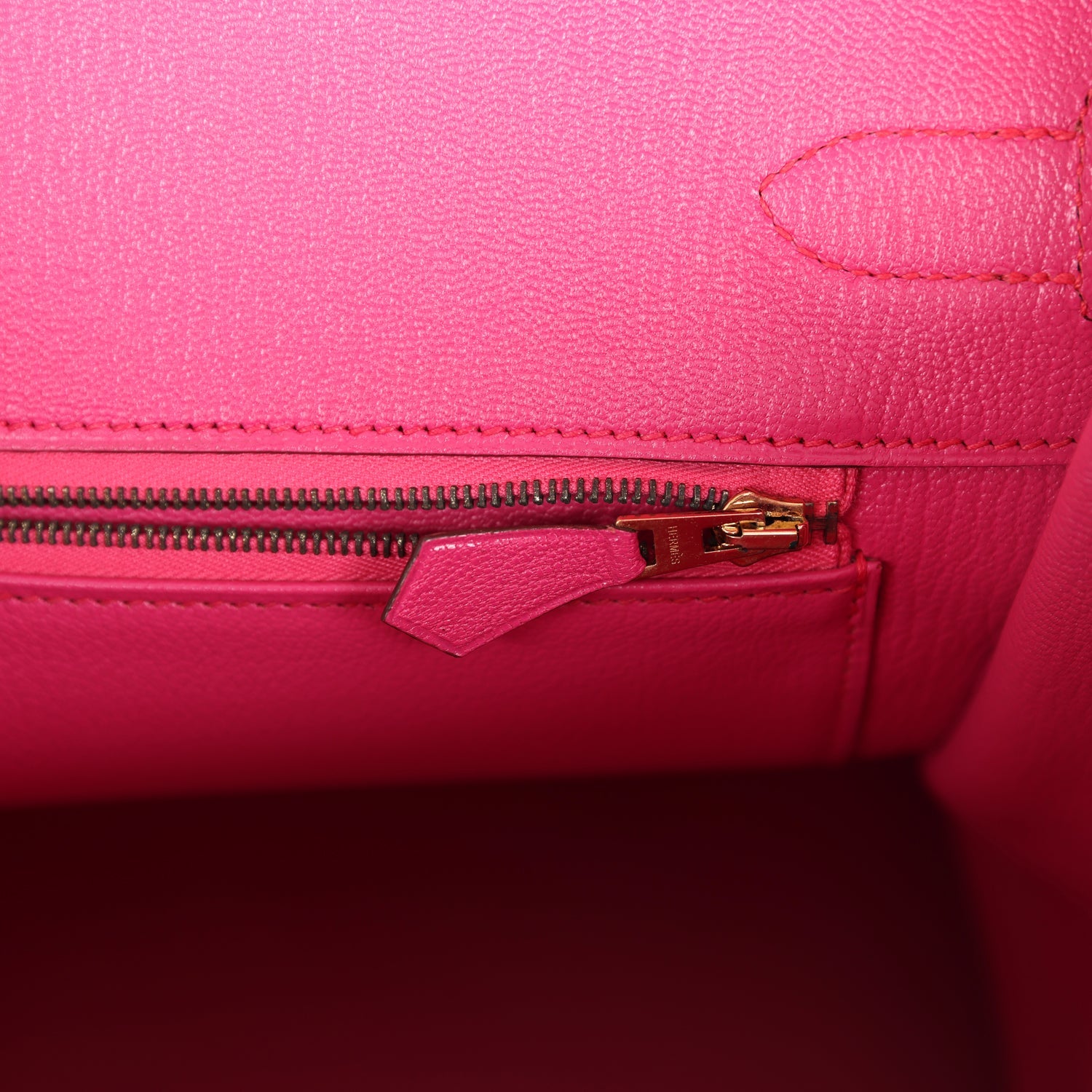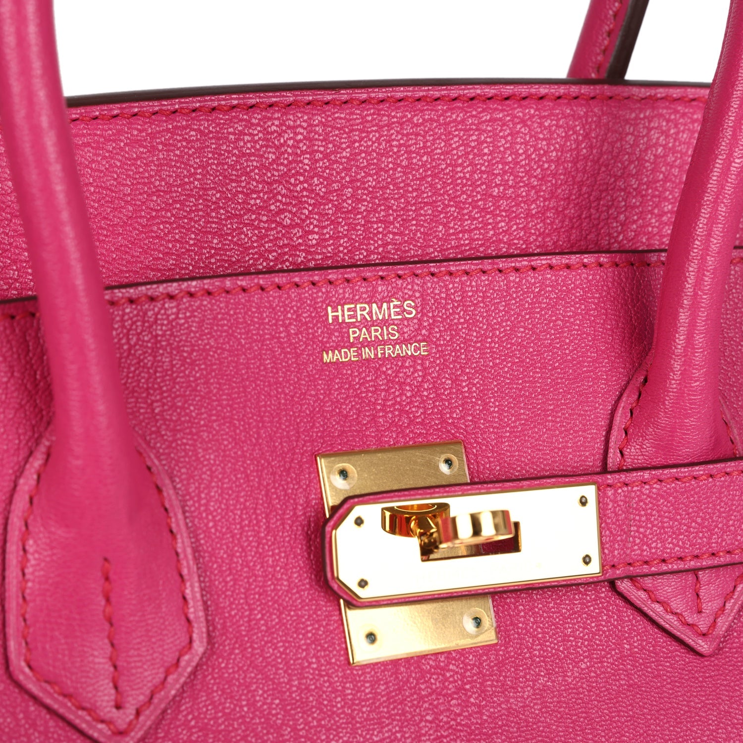 ThisBirkin is in Rose Shocking chevre mysore leather with gold hardware and has tonal stitching, front flap, two straps with center toggle closure, clochette with lock and two keys, and double rolled handles.