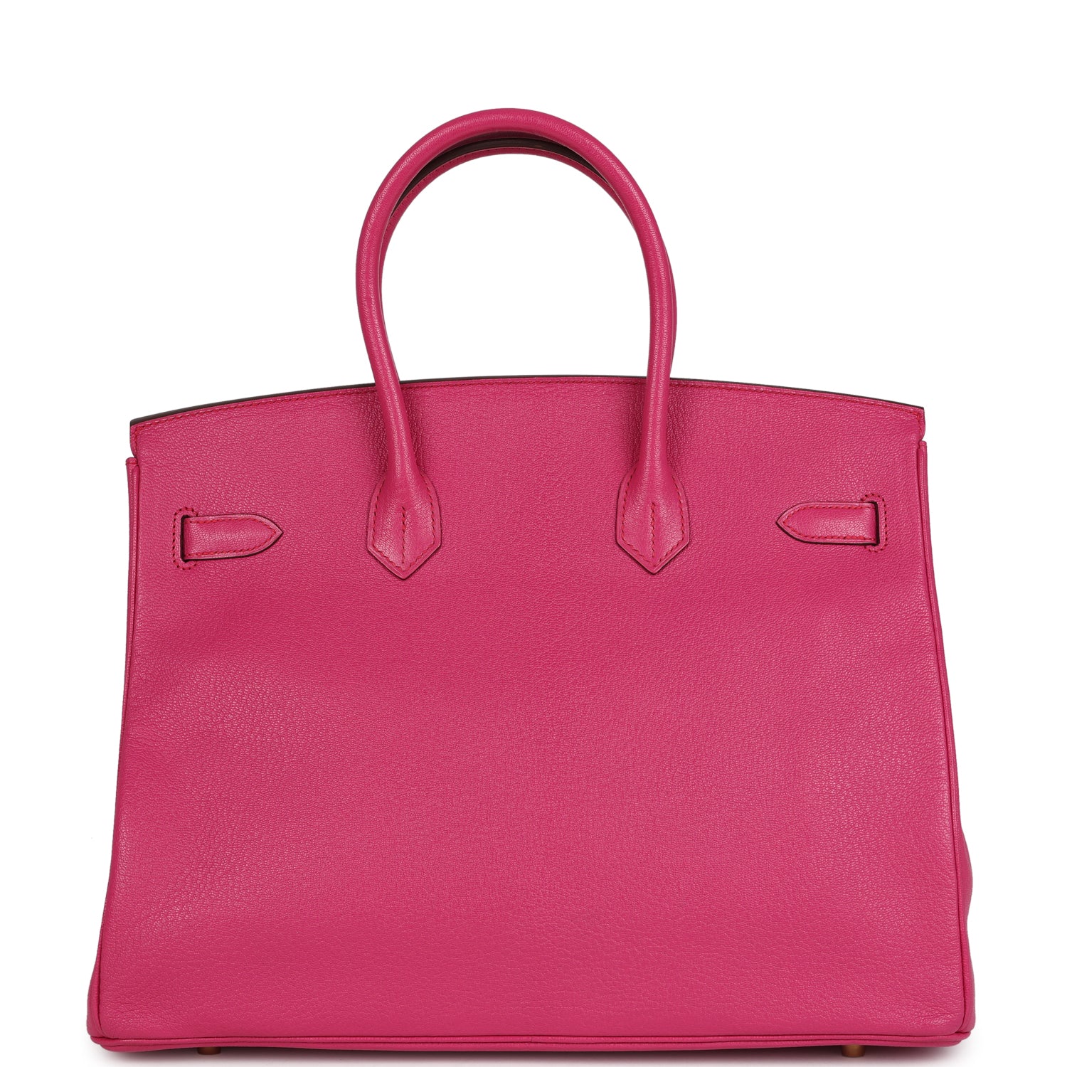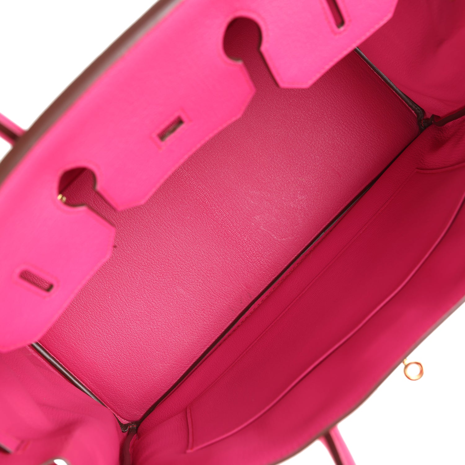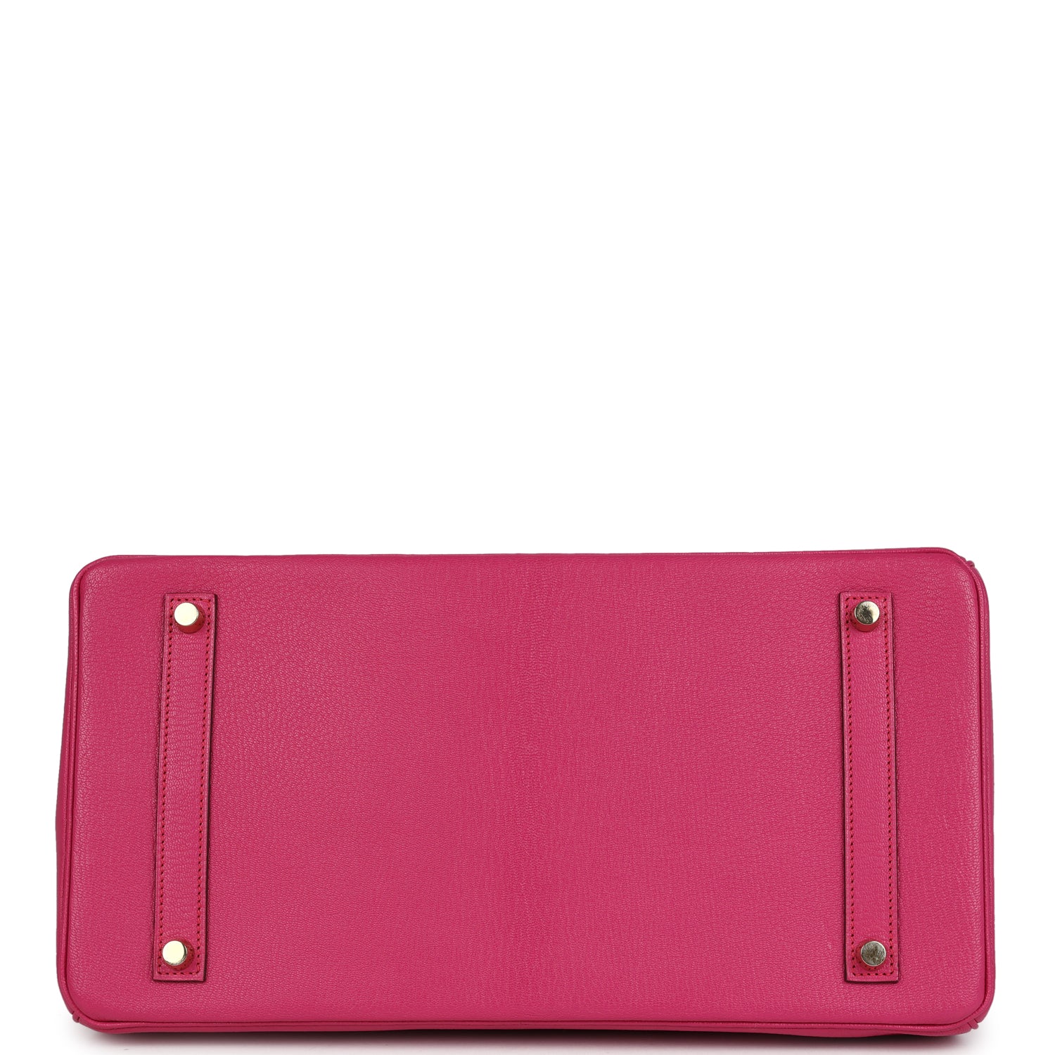ThisBirkin is in Rose Shocking chevre mysore leather with gold hardware and has tonal stitching, front flap, two straps with center toggle closure, clochette with lock and two keys, and double rolled handles.