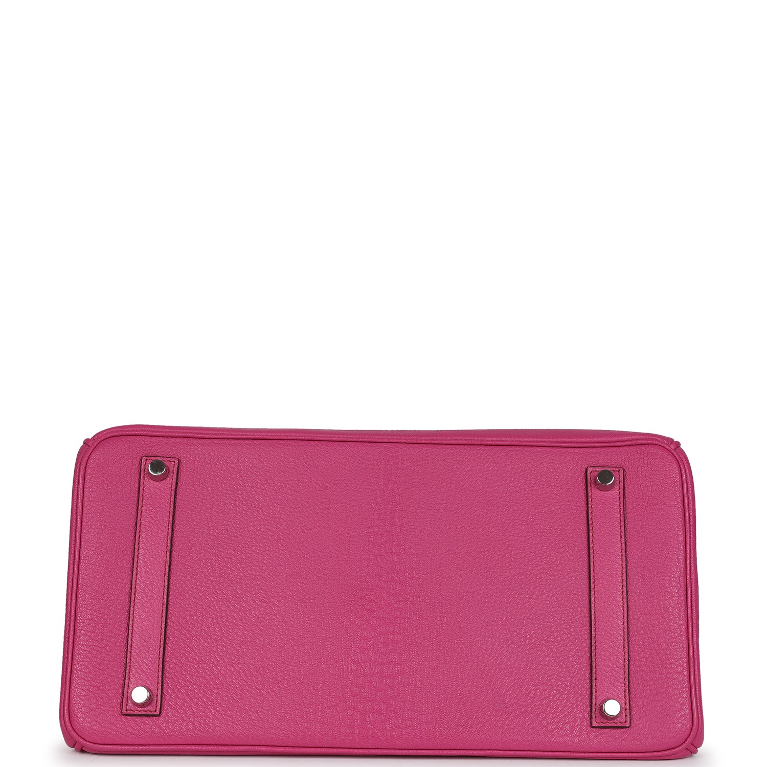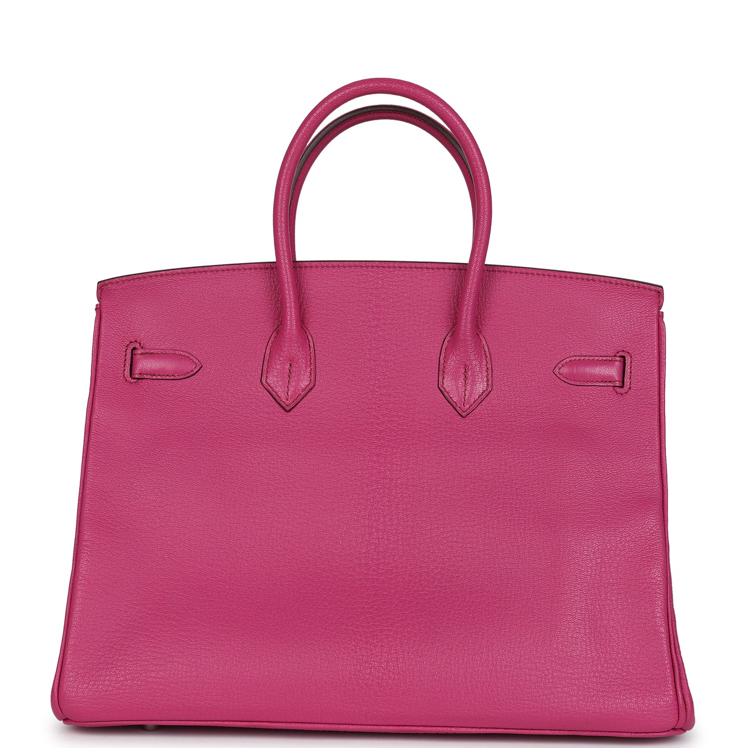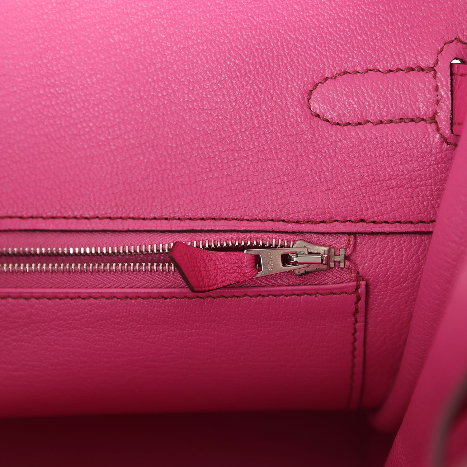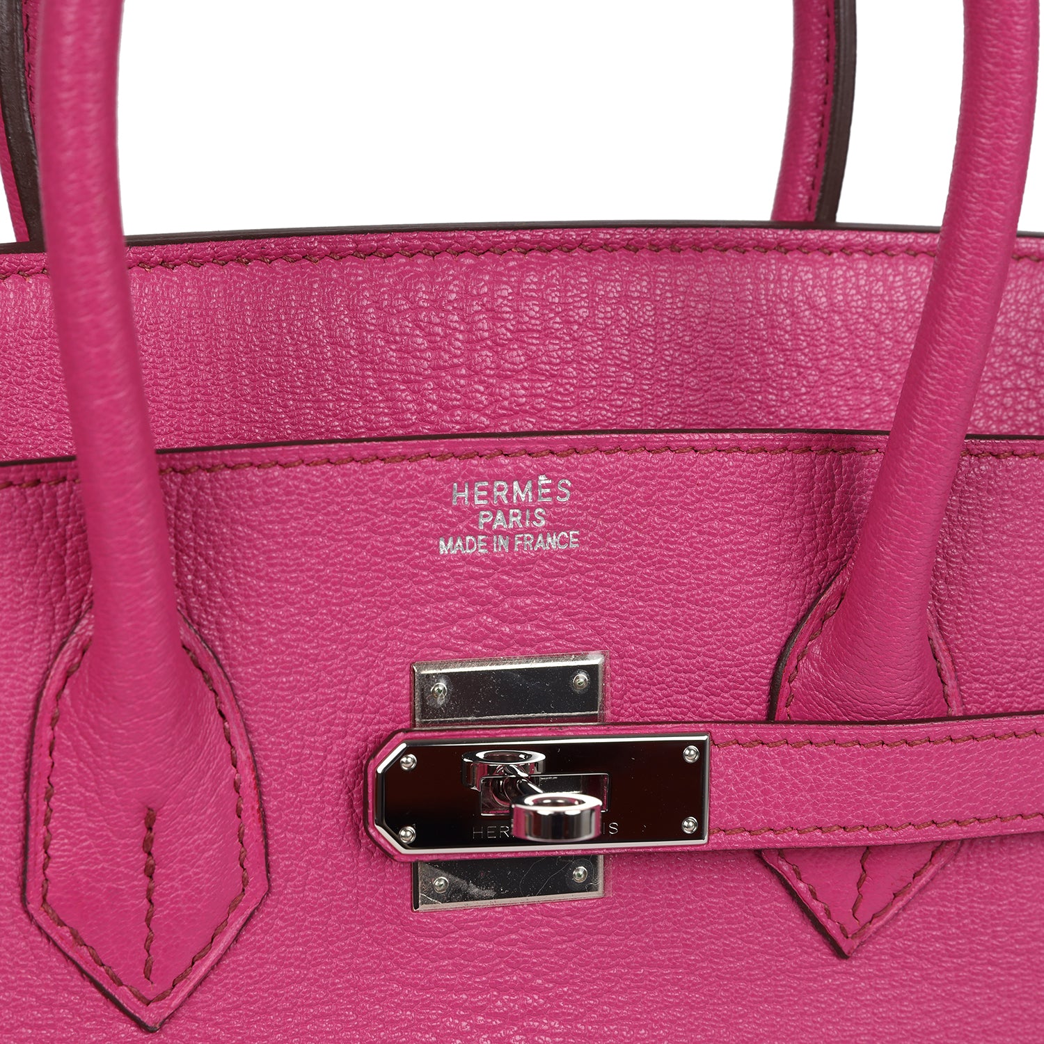 This Birkin is in Rose Shocking chevre mysore leather with palladium hardware and has contrast stitching, front flap, two straps with center toggle closure, clochette with lock and two keys, and double rolled handles.