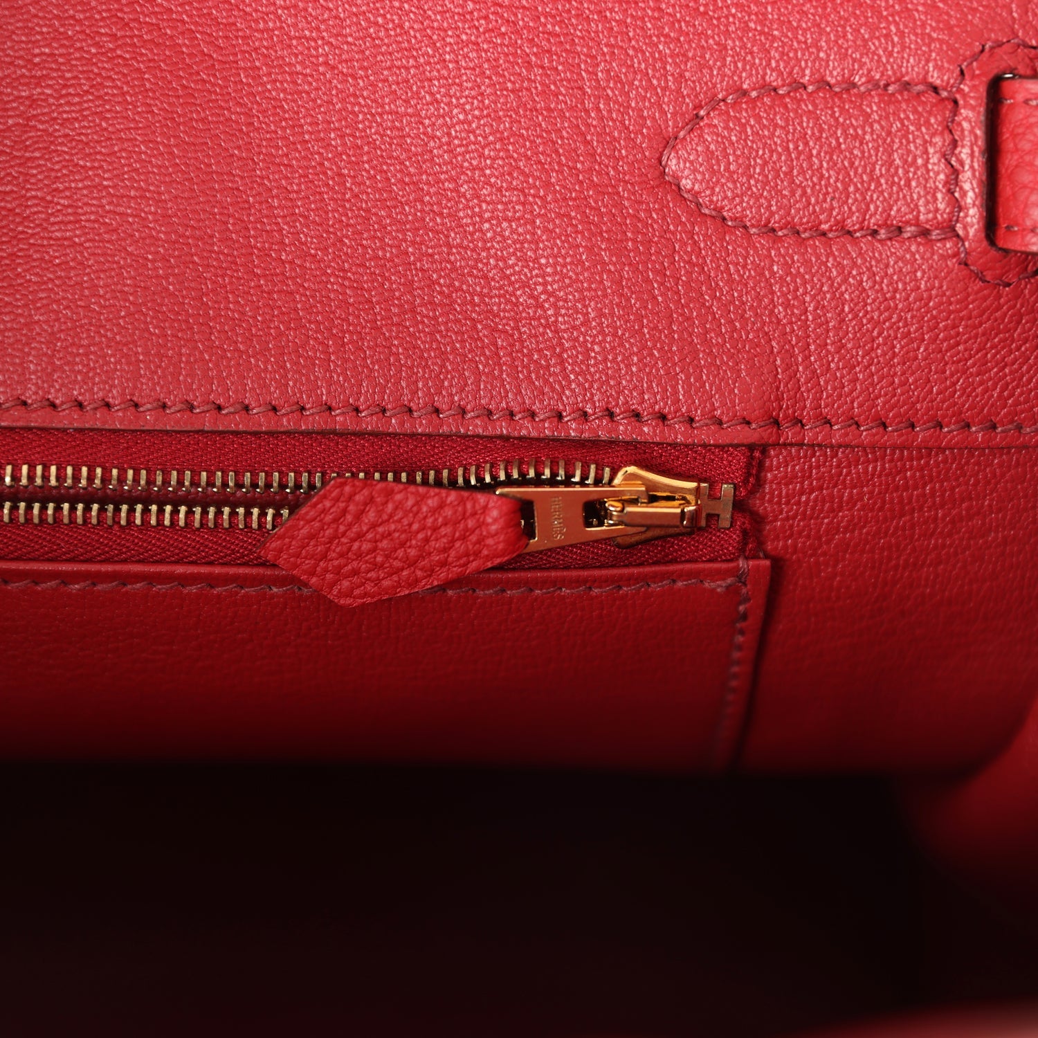 The interior is lined with Rouge Garance chevre and has one zip pocket with an Hermes engraved zipper pull and an open pocket on the opposite side.