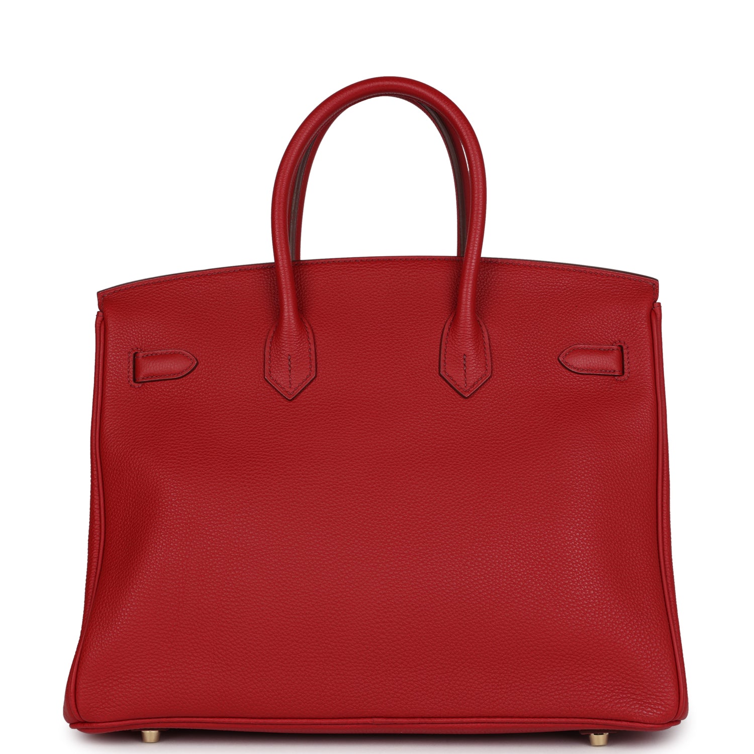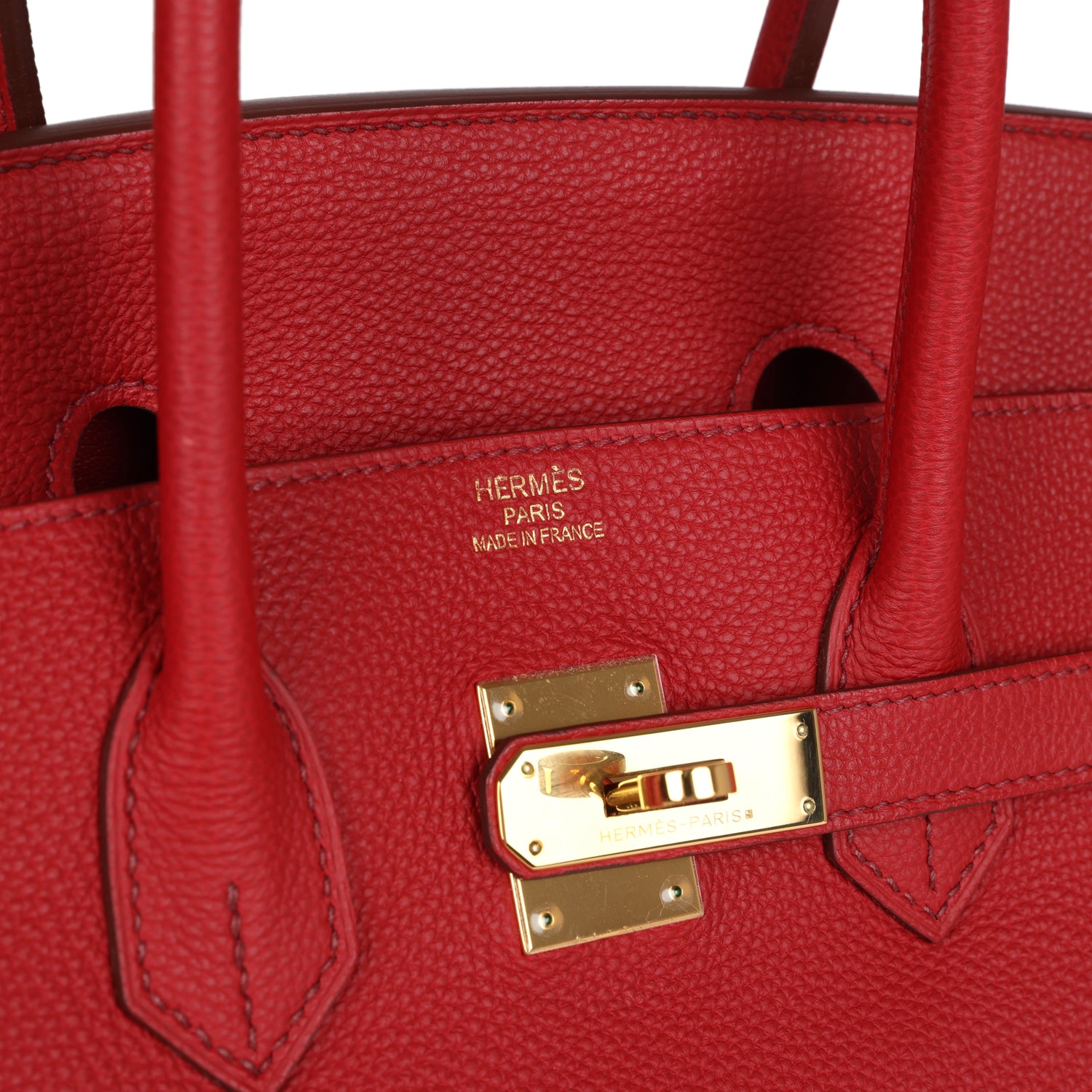 This Birkin is in Rouge Garance togo leather with gold hardware and tonal stitching, front flap, two straps with center toggle closure, clochette with lock and two keys, and double rolled handles.