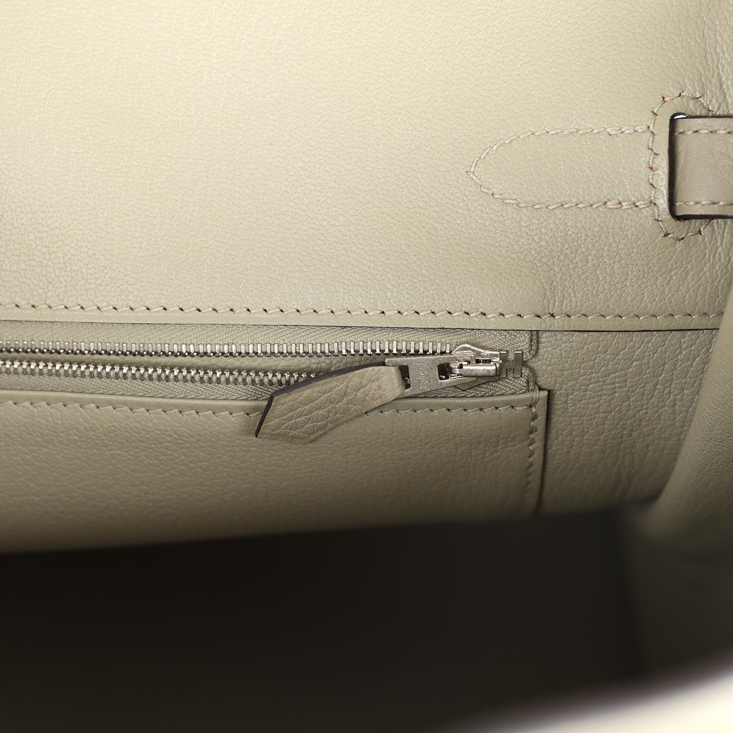 The interior is lined with Sauge chevre and has one zip pocket with an Hermes engraved zipper pull and an open pocket on the opposite side.