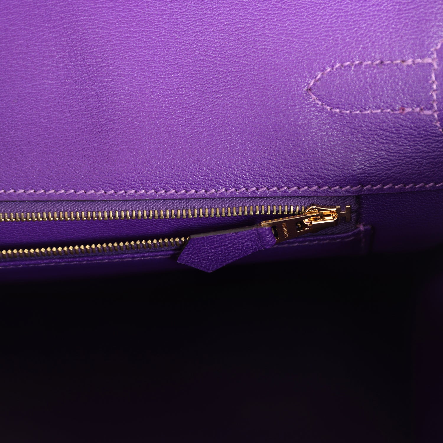 The interior is lined with Ultraviolet chevre and has one zip pocket with an Hermes engraved zipper pull and an open pocket on the opposite side.