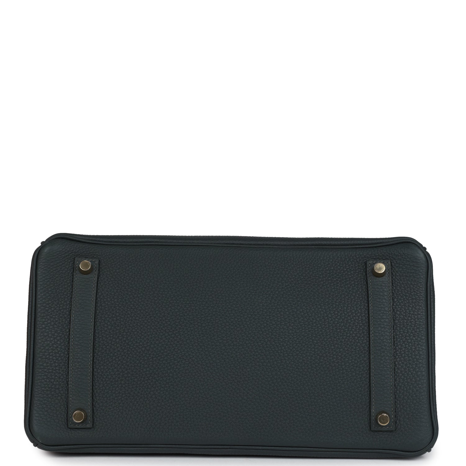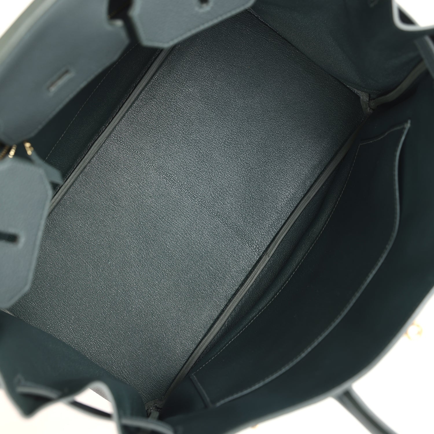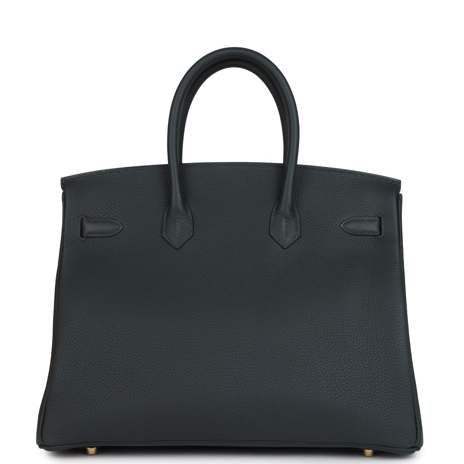 This Birkin is in Vert Fonce togo leather with gold hardware and has tonal stitching, front flap, two straps with center toggle closure, clochette with lock and two keys, and double rolled handles.