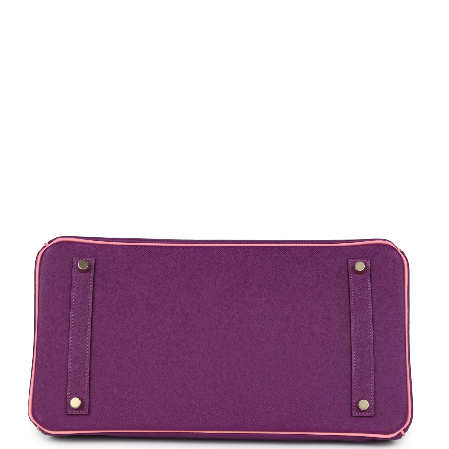 This Special Order Birkin is in Rose Confetti and Anemone epsom leather with gold hardware and has tonal stitching, front flap, two straps with center toggle closure, clochette with lock and two keys, and double rolled handles.