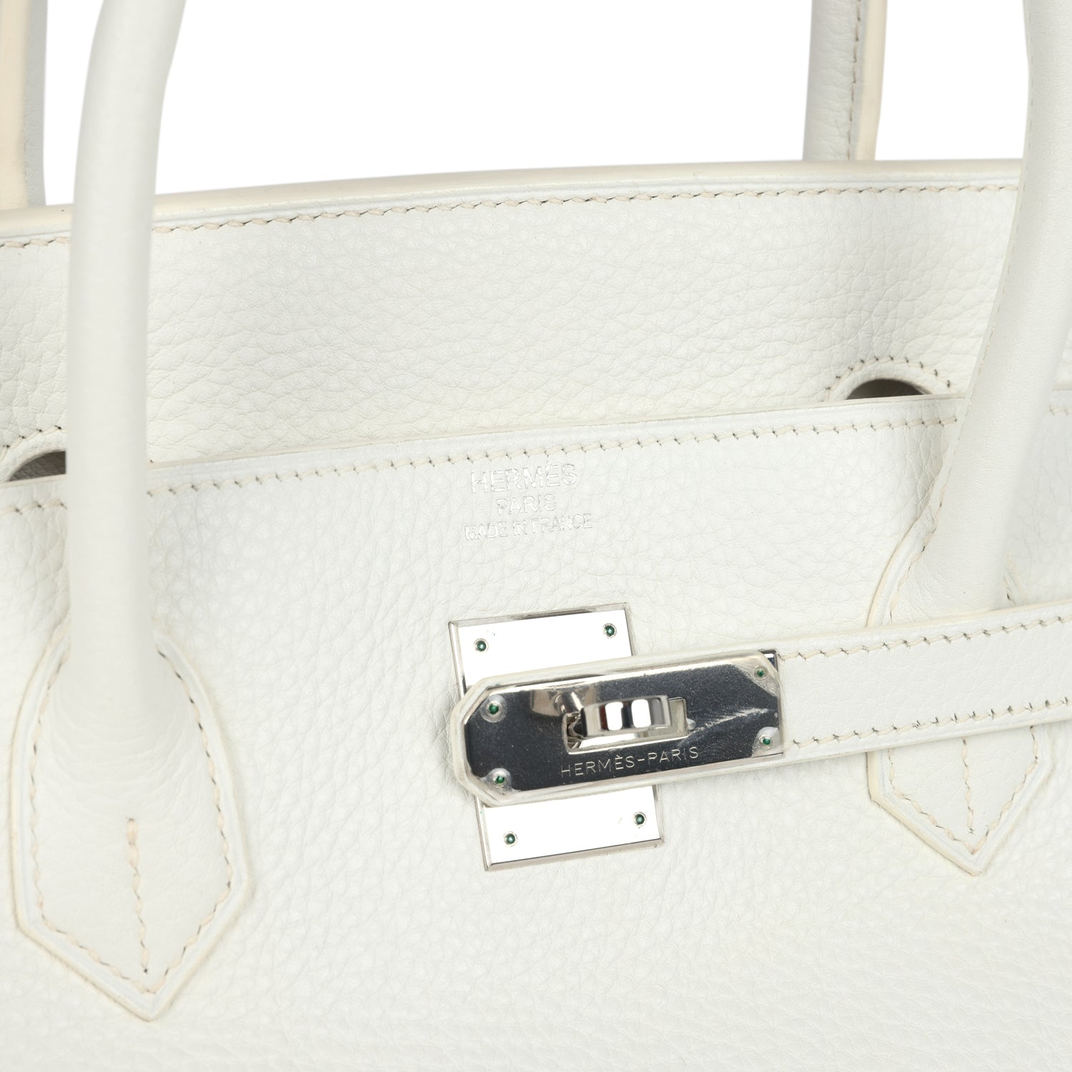 This Birkin is in White clemence leather with palladium hardware and has tonal stitching, two straps with front toggle closure, clochette with lock and two keys and double rolled handles.