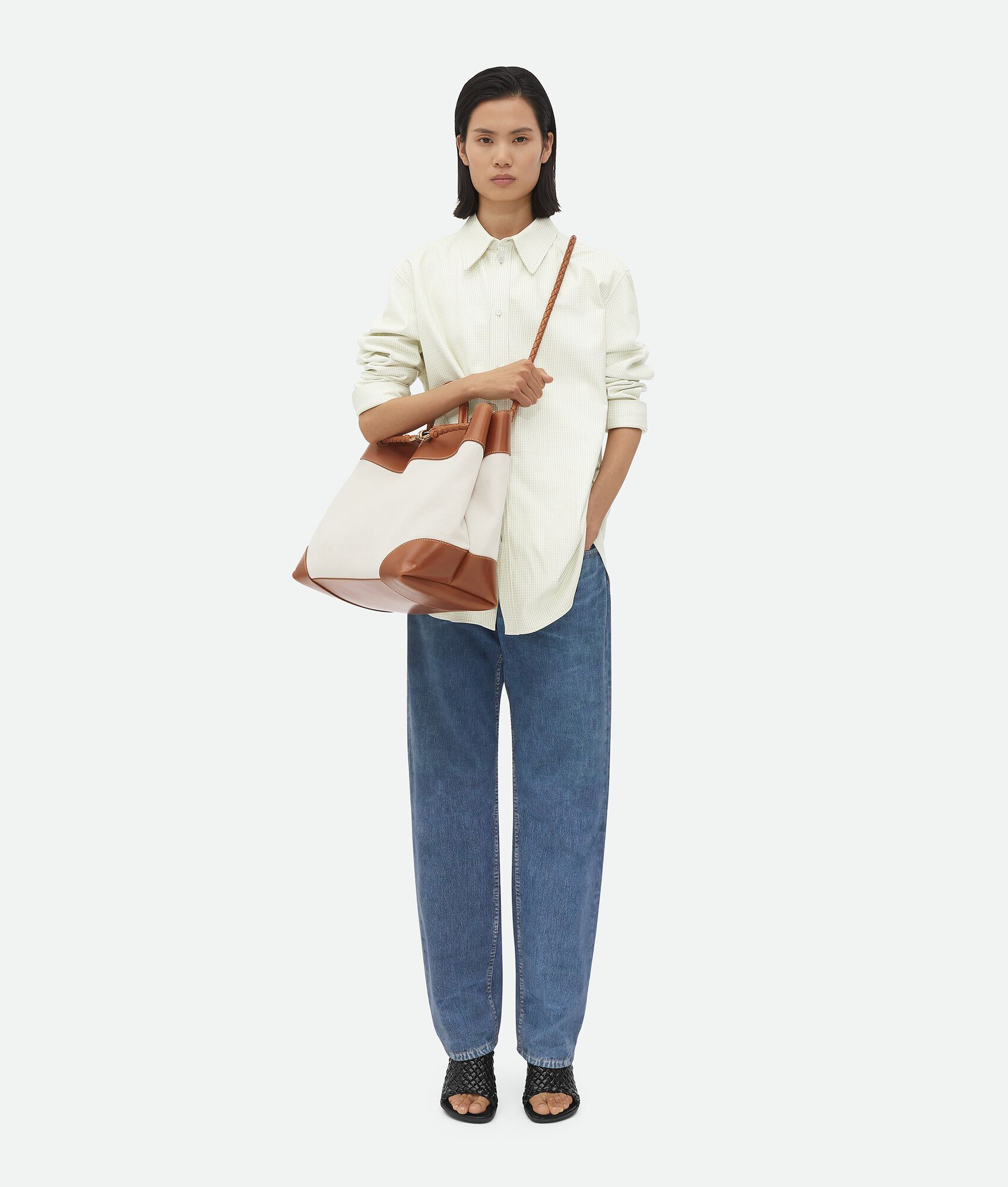 • Large top handle bag in weathered leather and canvas