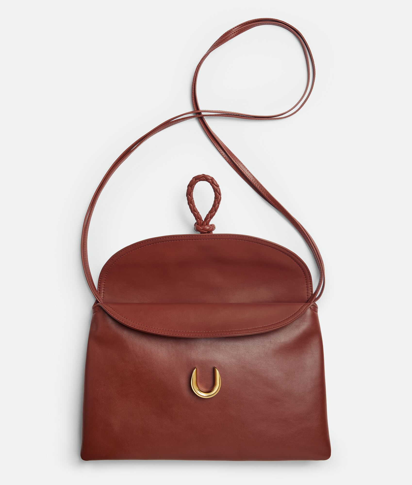 • Cross-body bag in smooth calfskin leather with double flap and fastening system consisting of metal elements and coaxial cord
