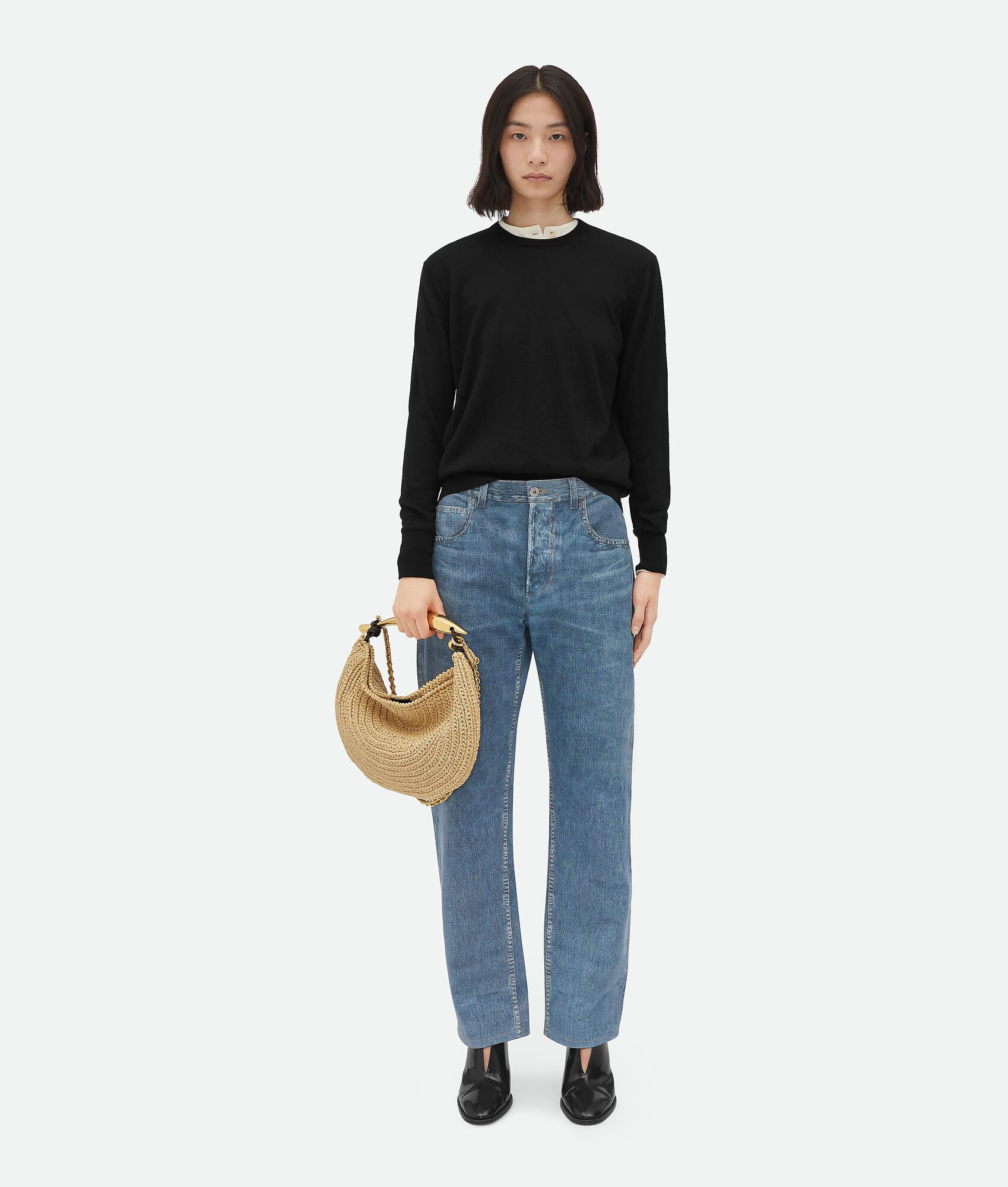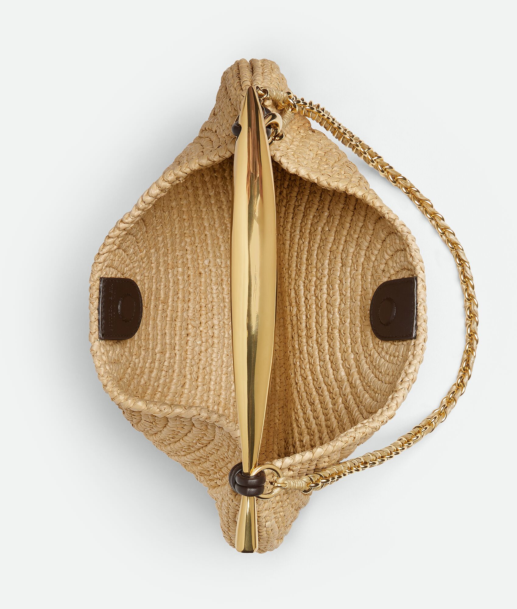 • Small raffia crochet bag with metallic top handle enriched by a leather braided shoulder chain