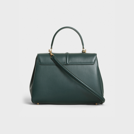 MEDIUM 16 BAG IN SATINATED CALFSKIN WITH A LEATHER HANDLE, A REMOVABLE SHOULDER STRAP, AND AN OUTER FLAT POCKET UNDER THE FLAP. THE BAG HAS A TWIST LOCK CLOSURE AND A CELINE PADLOCK ON A LEATHER KEY COVER.