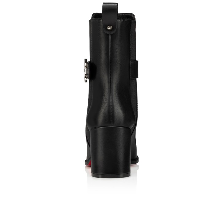 The CL Chelsea booty boot showcases clean lines and timeless elegance. With its almond shape and elastic insert on the side, it is crafted in black calf leather. Set on a 70 mm heel, it has a strap with a silver metal CL monogram. This urban style features a heel tab adorned with a Maison Christian Louboutin signature spike.