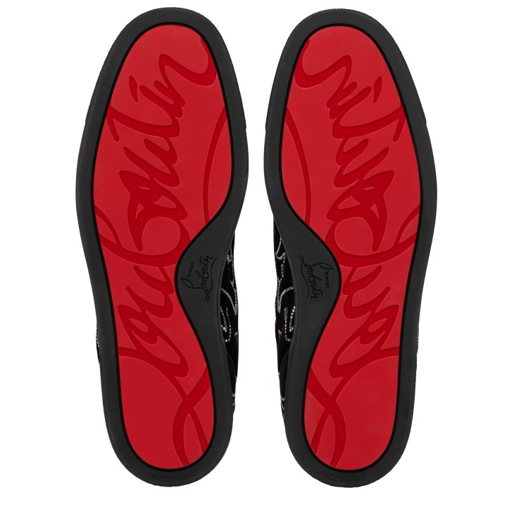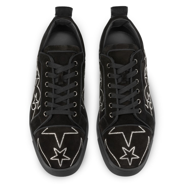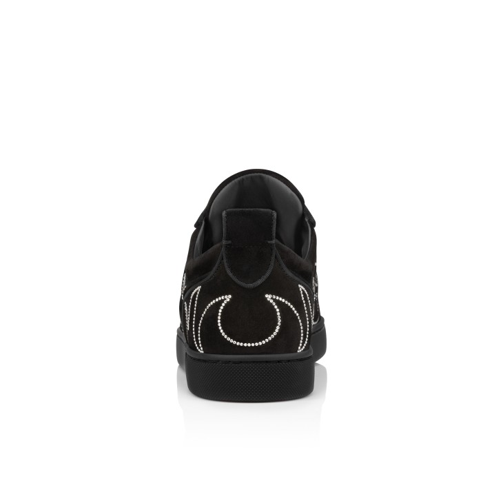 The timeless Giddy Vieira Strass sneaker has an irresistibly bold design. This Maison Christian Louboutin model sits on a black lug sole and is crafted in black veau velours with grosgrain trim. It is inspired by the Wild West and adorned with shimmering strass evoking the patterns seen on cowboy boots, while offering suppleness to your feet.