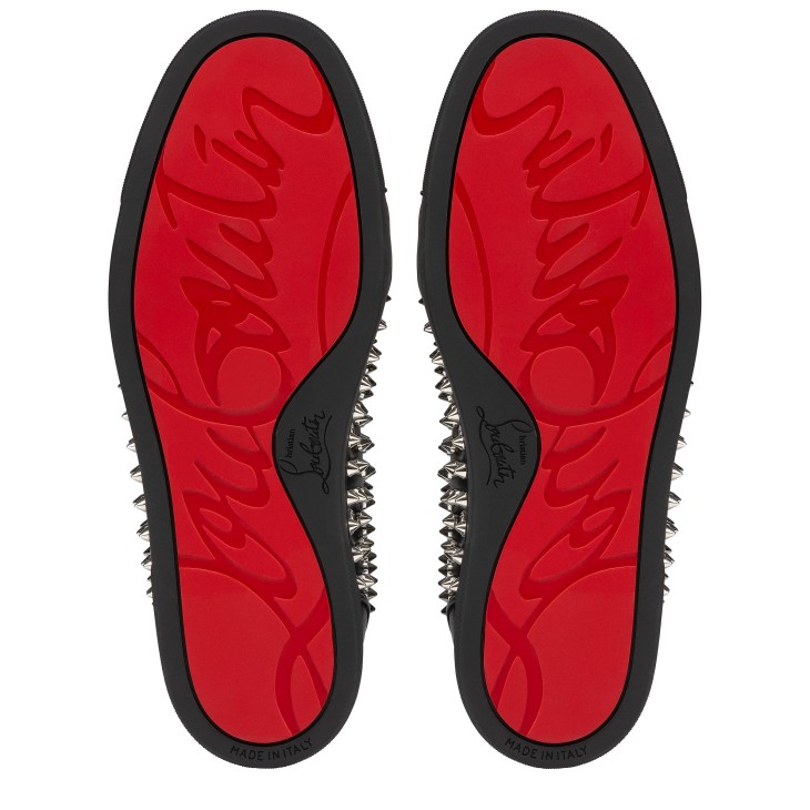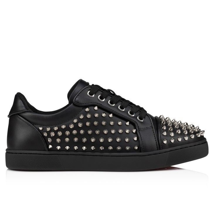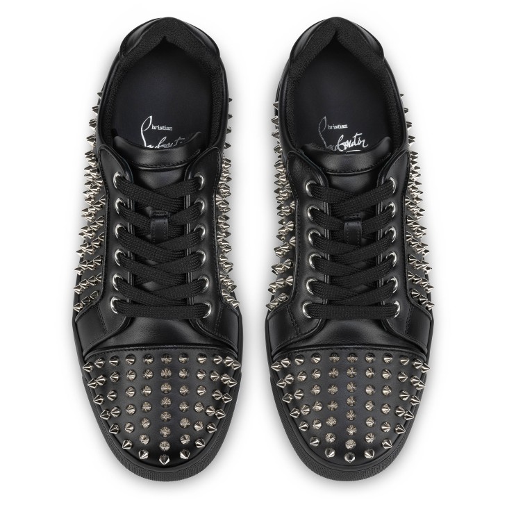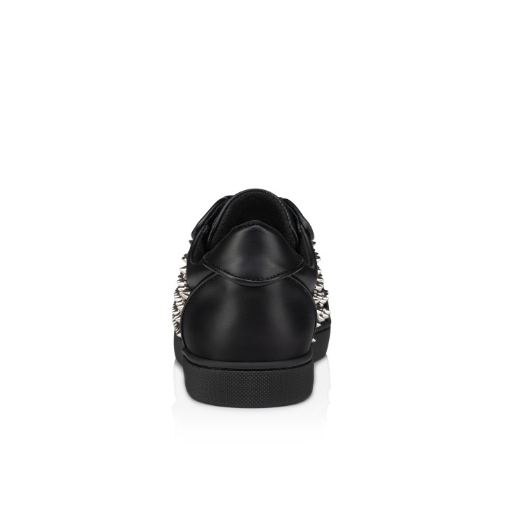 The timeless Vieira Night Spikes sneaker has an irresistibly bold design. This sneaker is crafted in supple black calf leather and has a black rubber sole. It features nappa leather trim for a sophisticated finish. It is adorned with all-over Maison Christian Louboutin signature silver spikes.