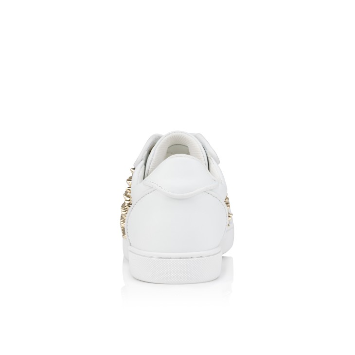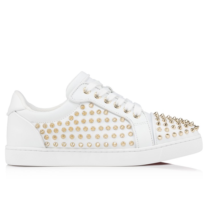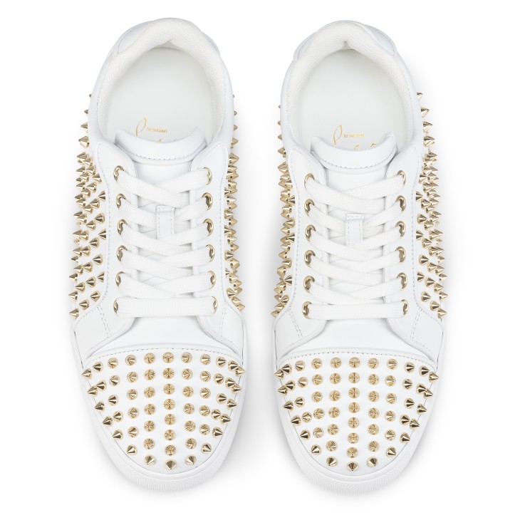 The timeless Vieira Night Spikes sneaker has an irresistibly bold design. This sneaker is crafted in supple white calf leather and has a black rubber sole. It features nappa leather trim for a sophisticated finish. It is adorned with all-over Maison Christian Louboutin signature gold spikes.