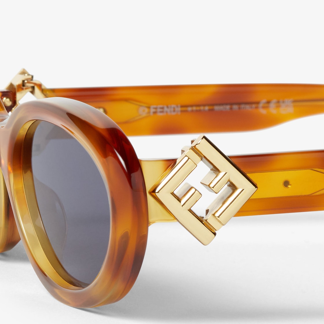 FF Diamonds oval glasses in light Havana acetate. Temples with functional FF Diamonds hinges in gold-colored metal. Blue lenses.