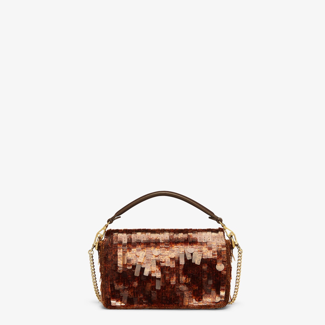 Iconic small Baguette bag hand-embroidered with brown, tortoiseshell-effect sequins of different shapes and sizes. Trimmed in brown calfskin and embellished with an FF clasp with plexiglass filling.