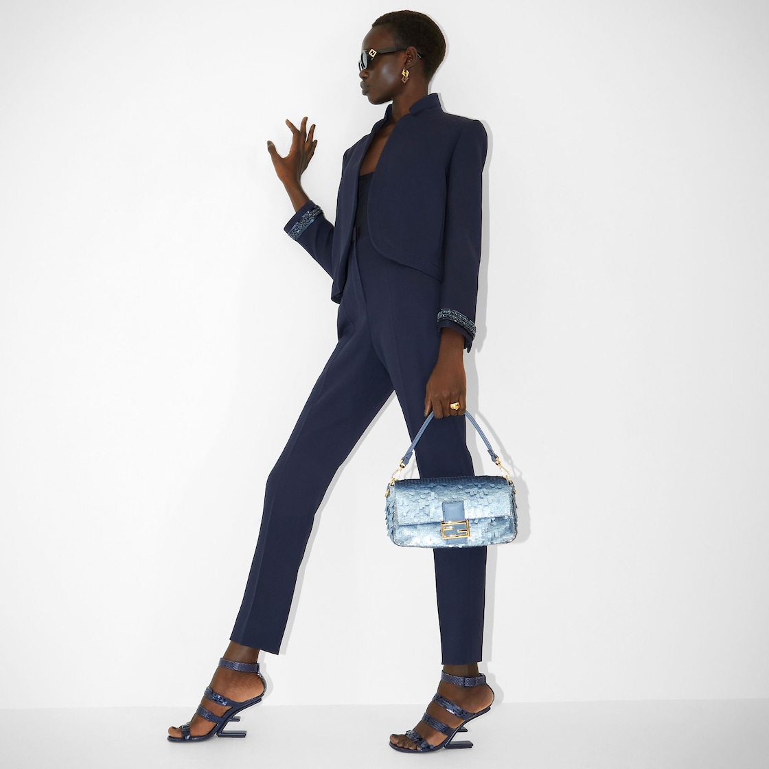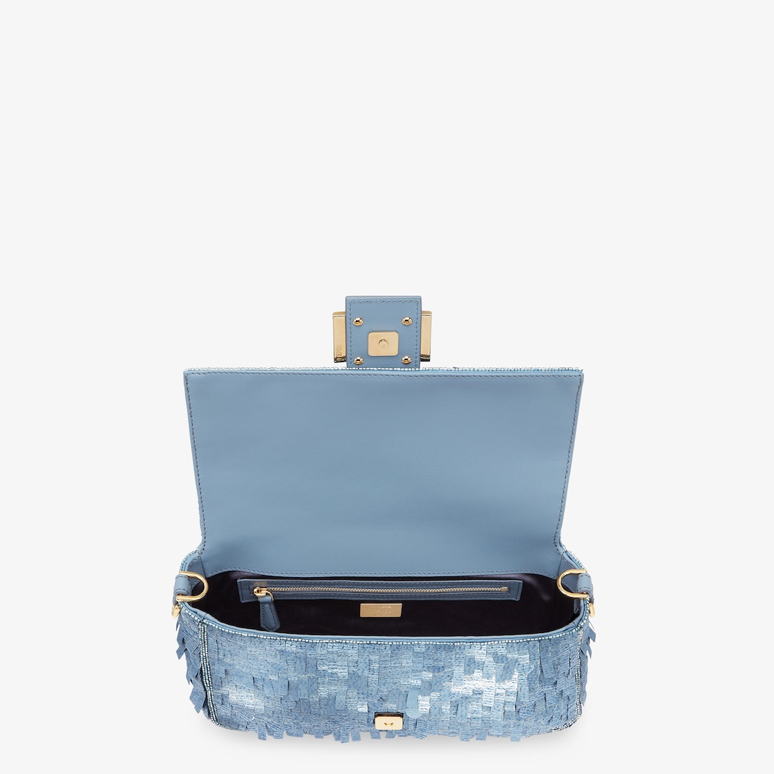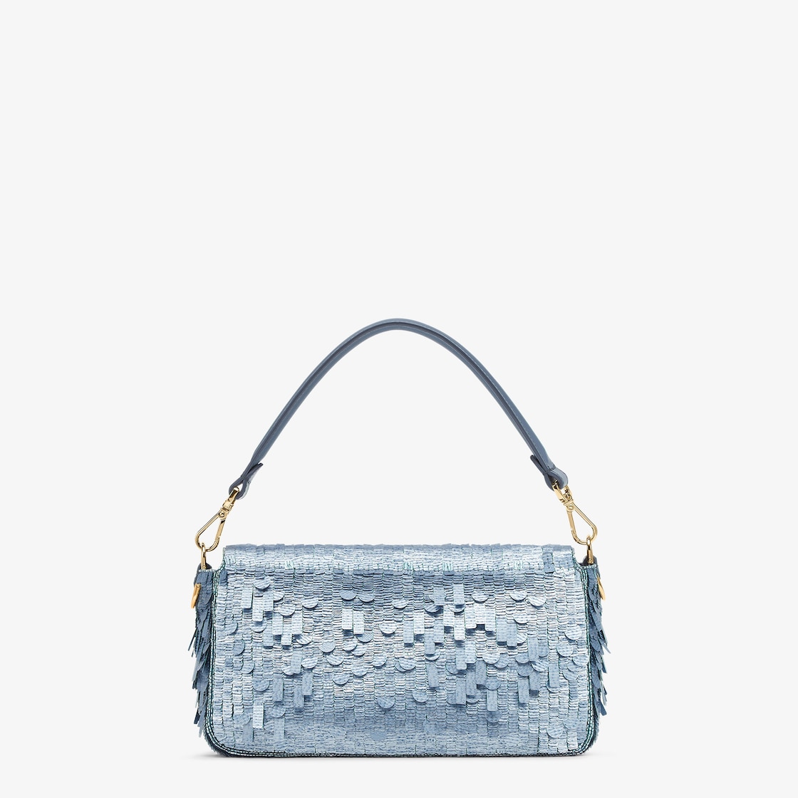 Hand-embroidered with light blue sequins of different shapes and sizes with a denim-effect finish. Trimmed in light blue calfskin and embellished with an FF clasp.