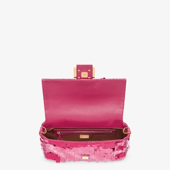 Iconic medium Baguette bag embroidered all-over with fuchsia metallic sequins in different shapes and sizes. Decorated with an FF clasp.