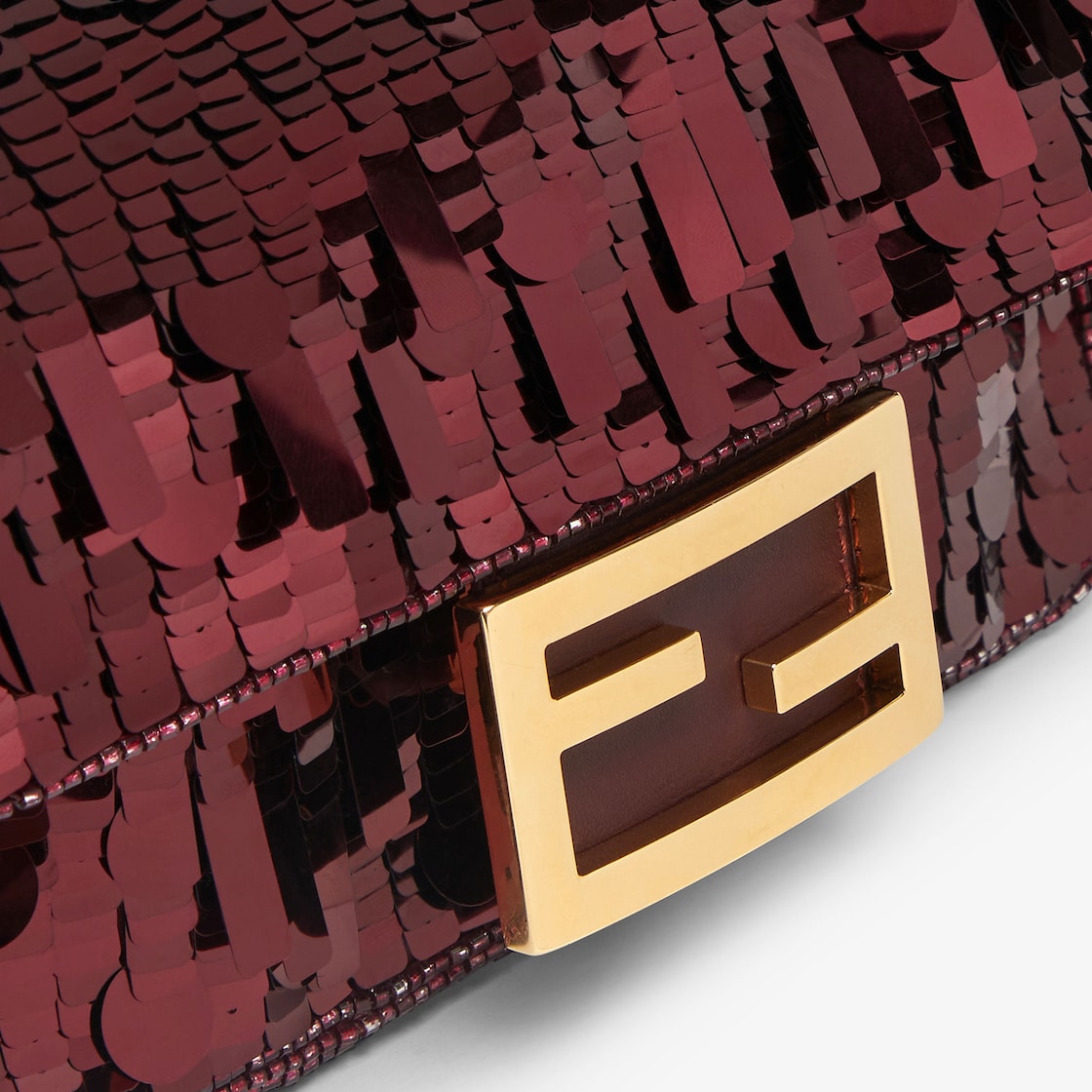Iconic mini Baguette bag, part of the collection curated with designer Stefano Pilati, embroidered all-over with burgundy metallic sequins in different shapes and sizes. Decorated with an FF clasp.