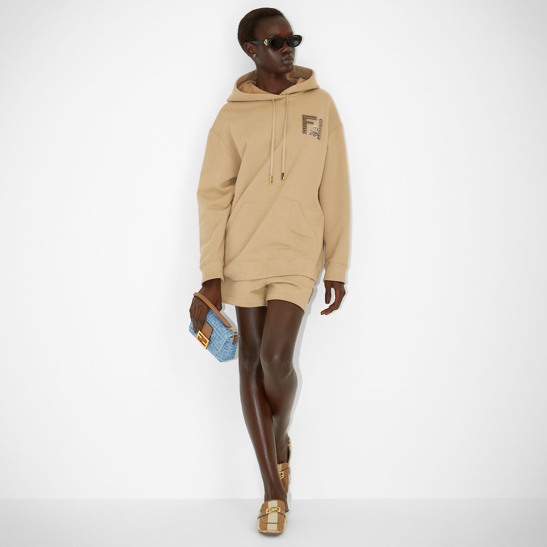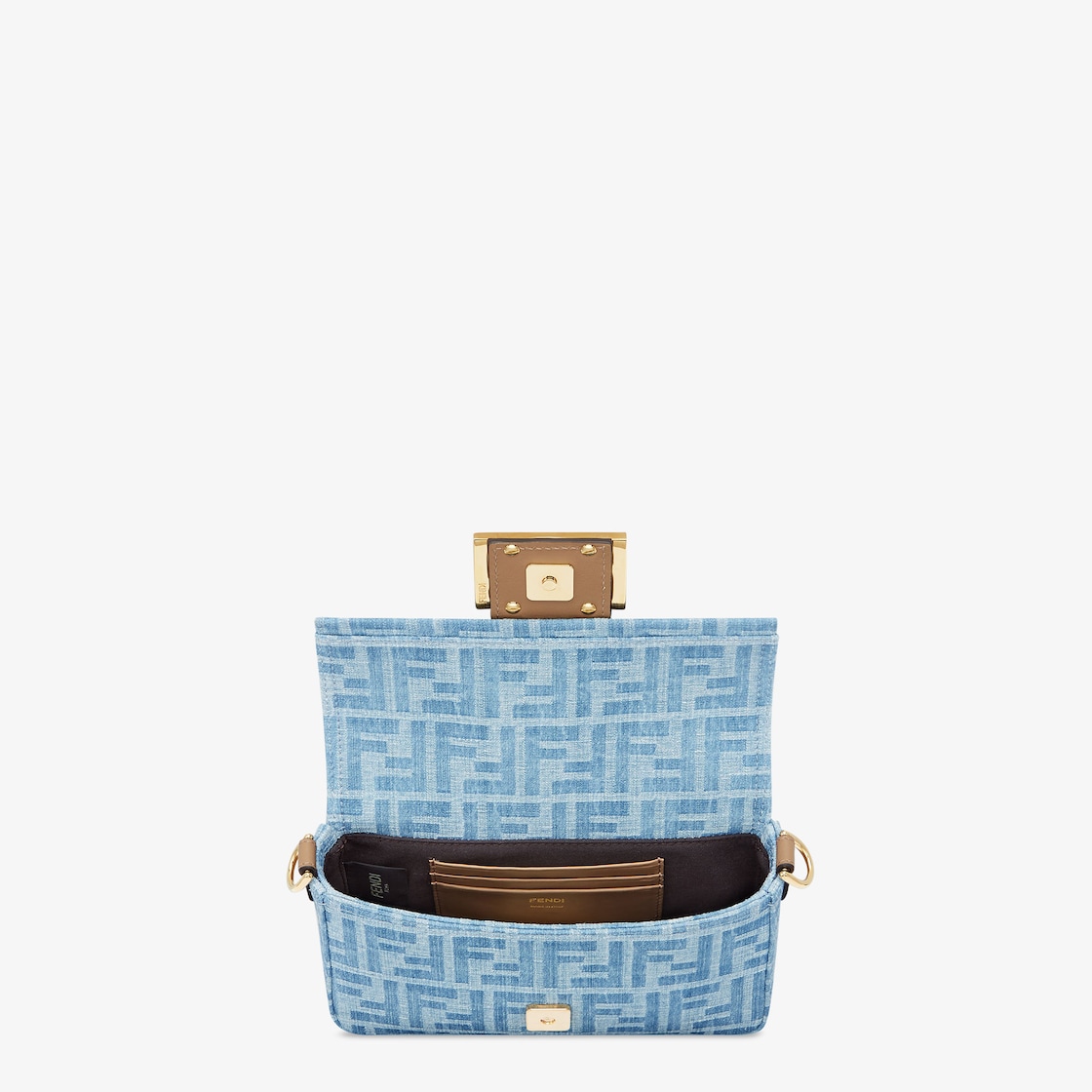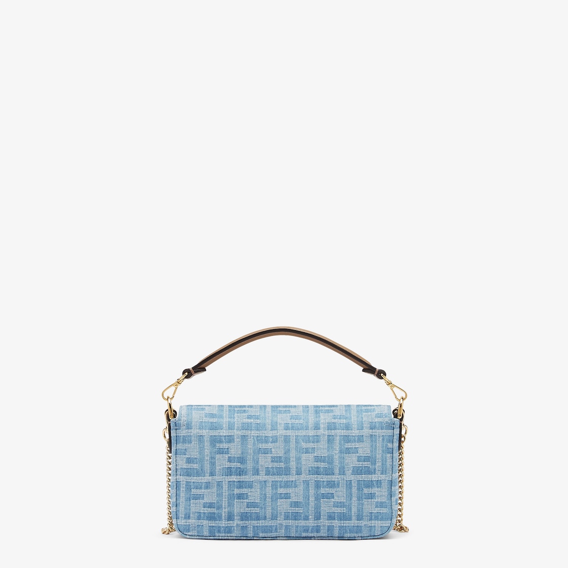 Iconic small Baguette bag made of light blue denim fabric with the FF motif, trimmed in beige calfskin and embellished with an FF clasp.