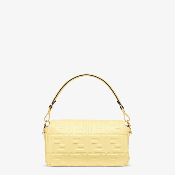 Iconic medium Baguette bag made of yellow soft nappa leather with a three-dimensional textured embossed FF motif. Decorated with an FF clasp.