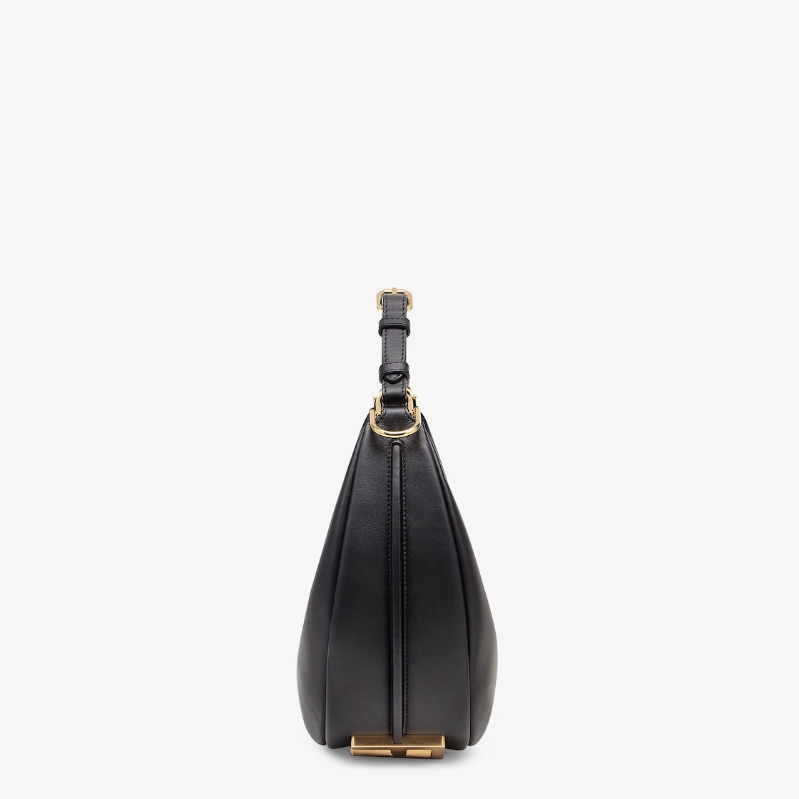Small hobo bag made of soft black leather, with vintage gold metal FENDI lettering visible when the bag is worn under the arm.