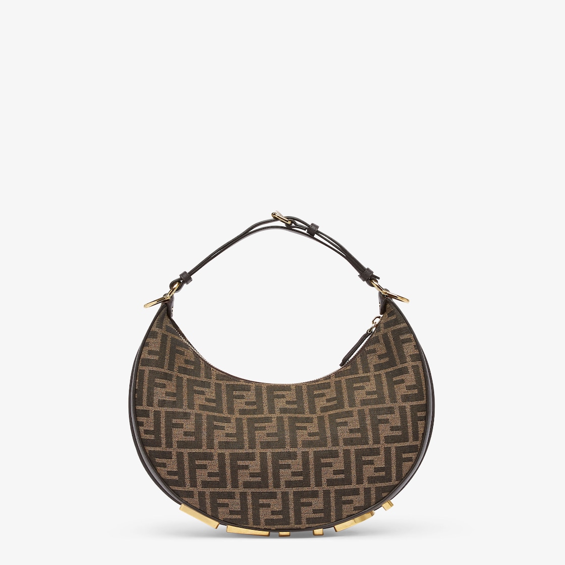 Made of jacquard fabric with the iconic FF motif in brown, decorated with vintage gold-finish metal FENDI lettering on the base, visible when wearing the bag under the arm.