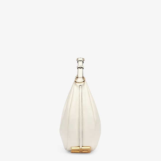 Small hobo bag made of soft white leather, with vintage gold metal FENDI lettering visible when the bag is worn under the arm.
