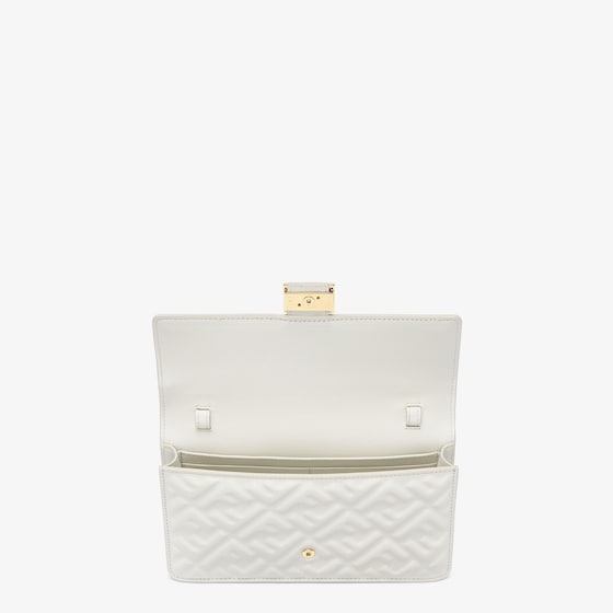 Compact Baguette wallet with flap and FF clasp. Interior compartment with six card slots. Double shoulder strap, an adjustable leather option and a detachable thin chain option: to carry the bag like a clutch, under the arm or wear it cross-body. Made of shiny, white nappa leather with a three-dimensional, embossed diagonal FF motif. Gold-finish metalware.