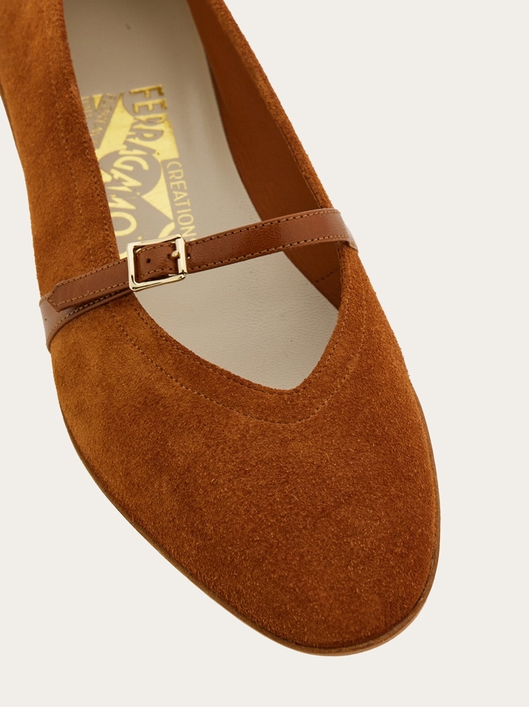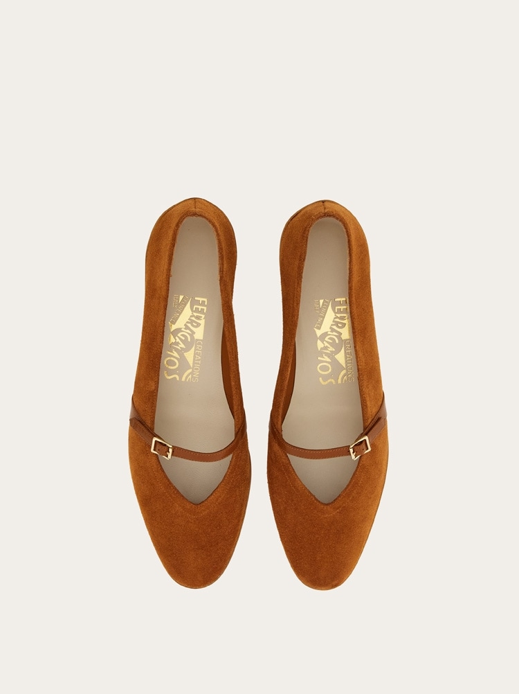 Designed in 1954 for Audrey Hepburn, this suede ballet shoe is a symbol of the fashion history and a testament to Ferragamo’s impeccable craftsmanship. It features a delicate kidskin strap and a buckle that add a touch of sophistication. The low, oval heel and shell-shaped sole draw inspiration from Native American opanke moccasins, merging comfort with style.