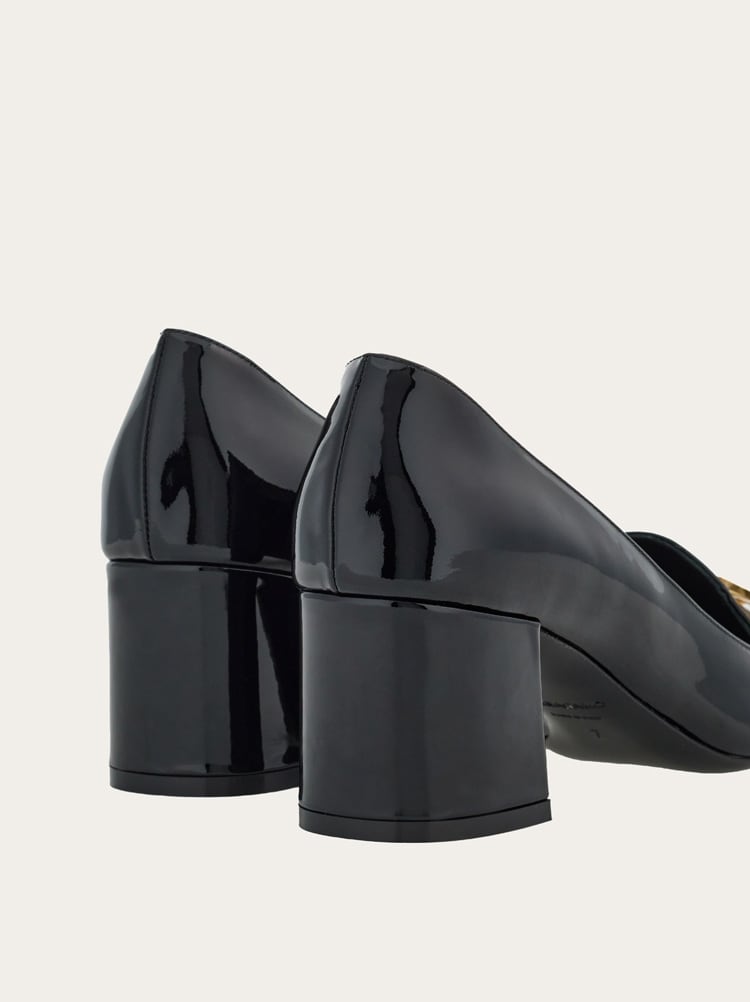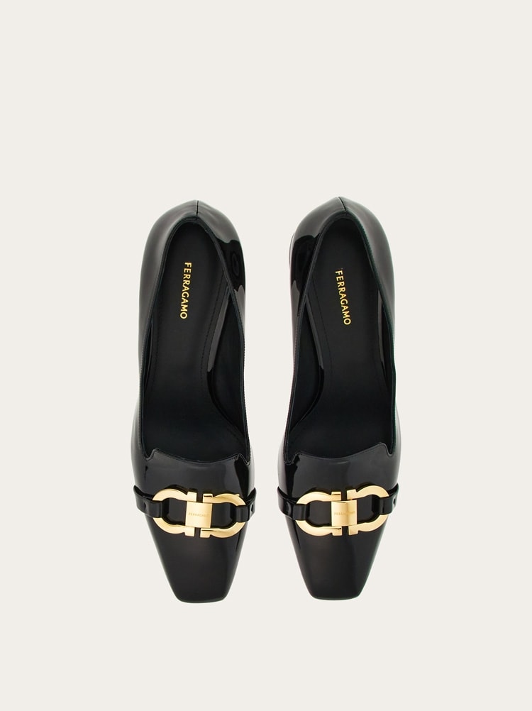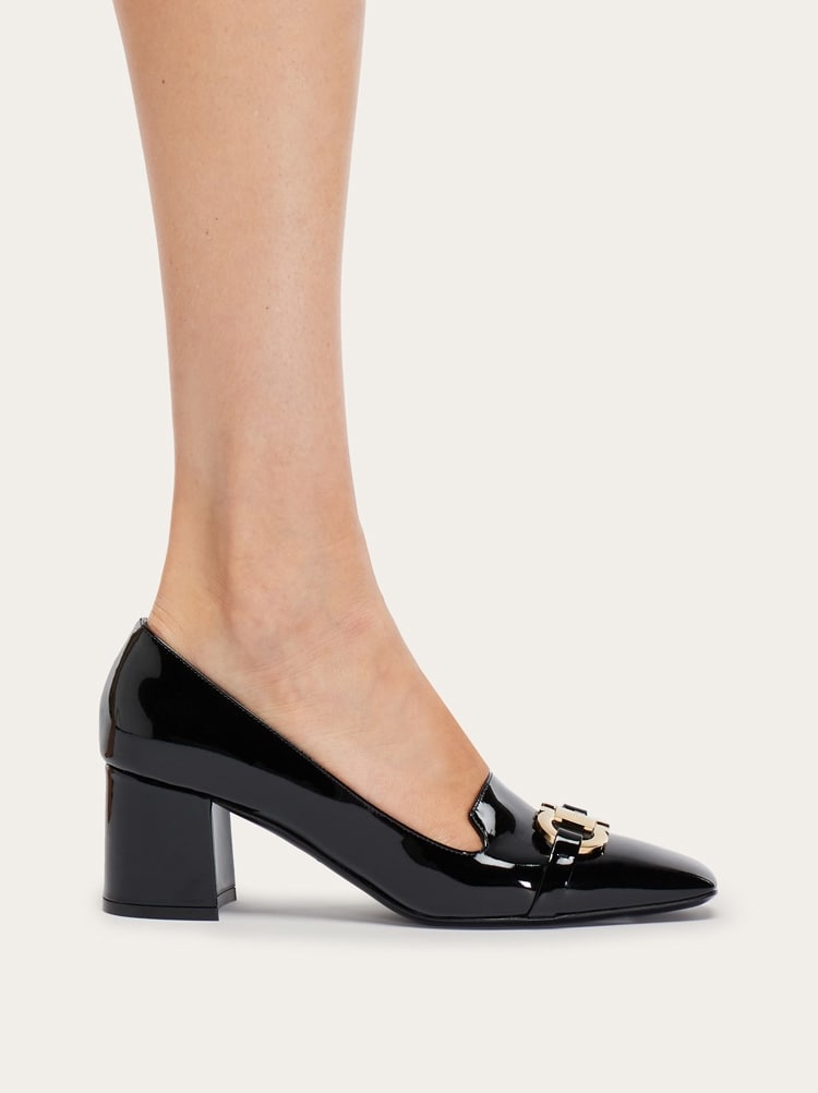 Made of high shine patent leather, this uptown ladies loafer is the symbol of contemporary elegance. The block heel and padded leather insole ensure absolute comfort while the golden Gancio buckle on the upper brings a touch of high end glam.