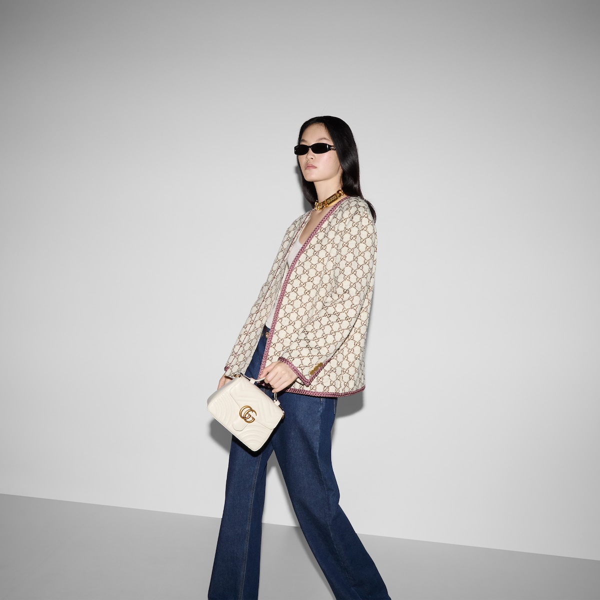 The mini GG Marmont top handle bag has a softly structured shape and an oversized flap closure with Double G hardware. Equipped with a leather top handle and chain shoulder strap, made in matelassé chevron leather with a heart on the back.