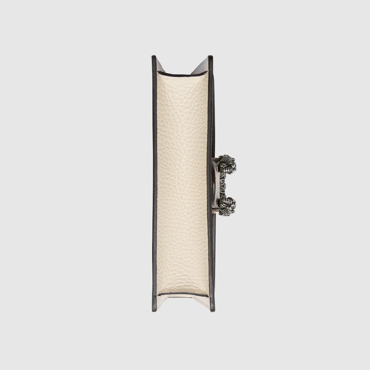 Made in resistant textured leather, the structured Dionysus super mini bag is completed with a tiger head spur closure, enriched with crystal stones. Equipped with a key ring that can be used to attach this bag to a separate larger bag.