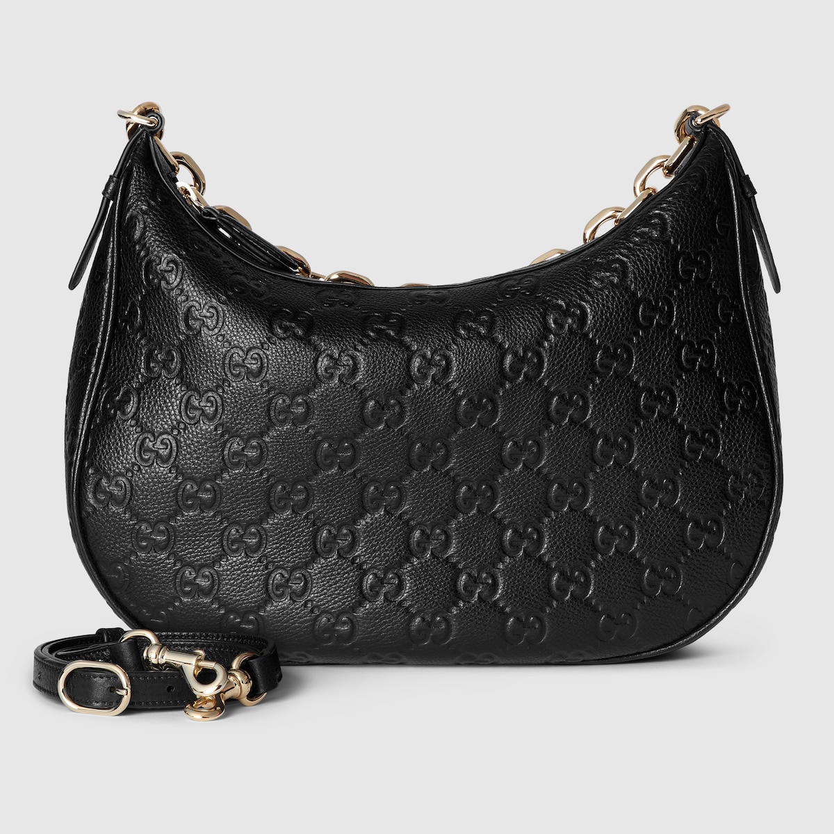 The new GG Emblem collection reinterprets the House’s history of elegance and craftsmanship. This medium shoulder bag is crafted from GG grainy leather and comes with a chain strap.