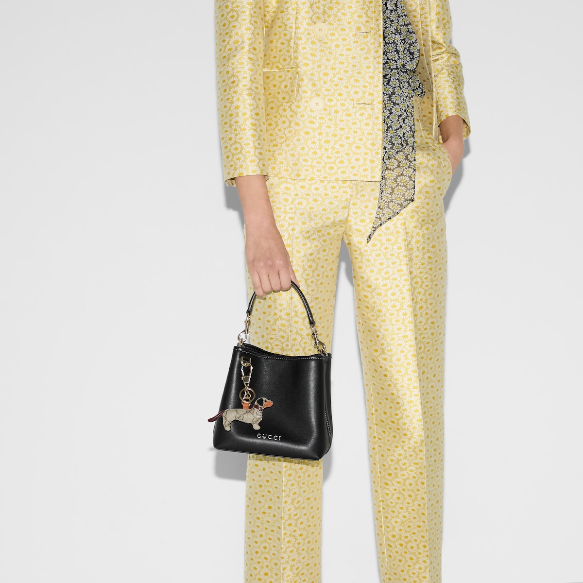The new GG Emblem collection reinterprets the House’s history of elegance and craftsmanship. This mini bucket bag highlights functional design with an interior compartment.