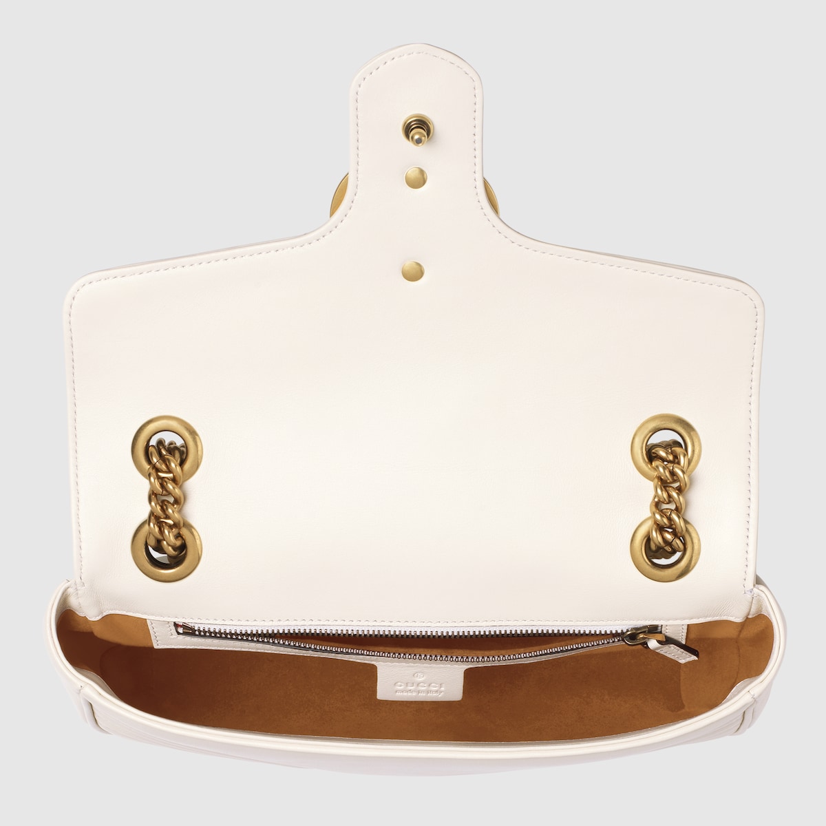 The small GG Marmont chain shoulder bag has a softly structured shape and an oversized flap closure with Double G hardware. The sliding chain strap can be worn multiple ways, changing between a shoulder and a top handle bag. Made in matelassé chevron leather with a heart on the back.