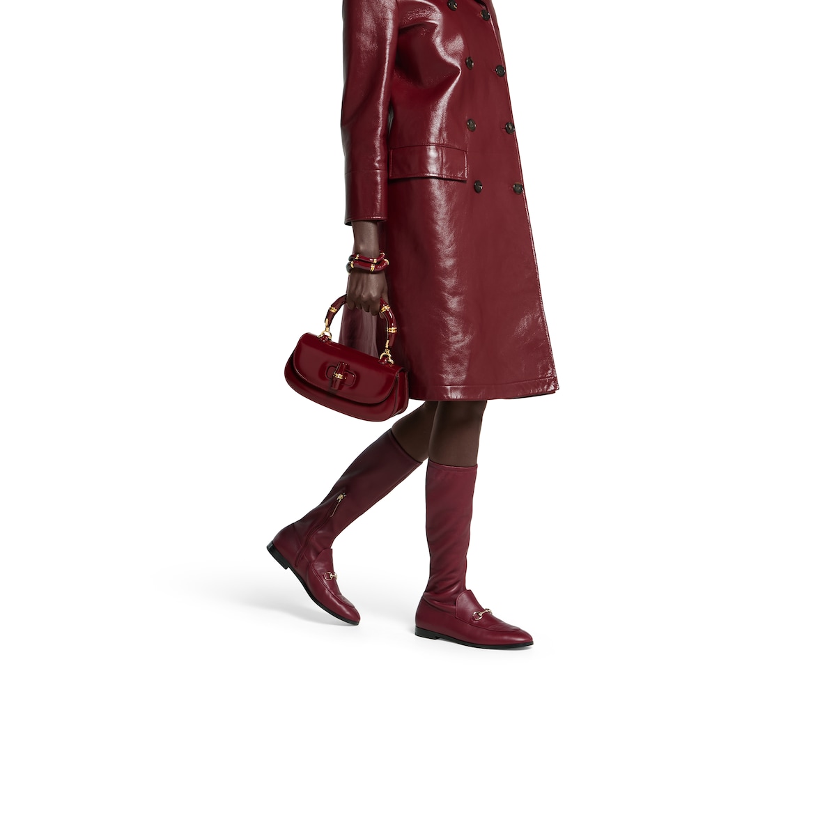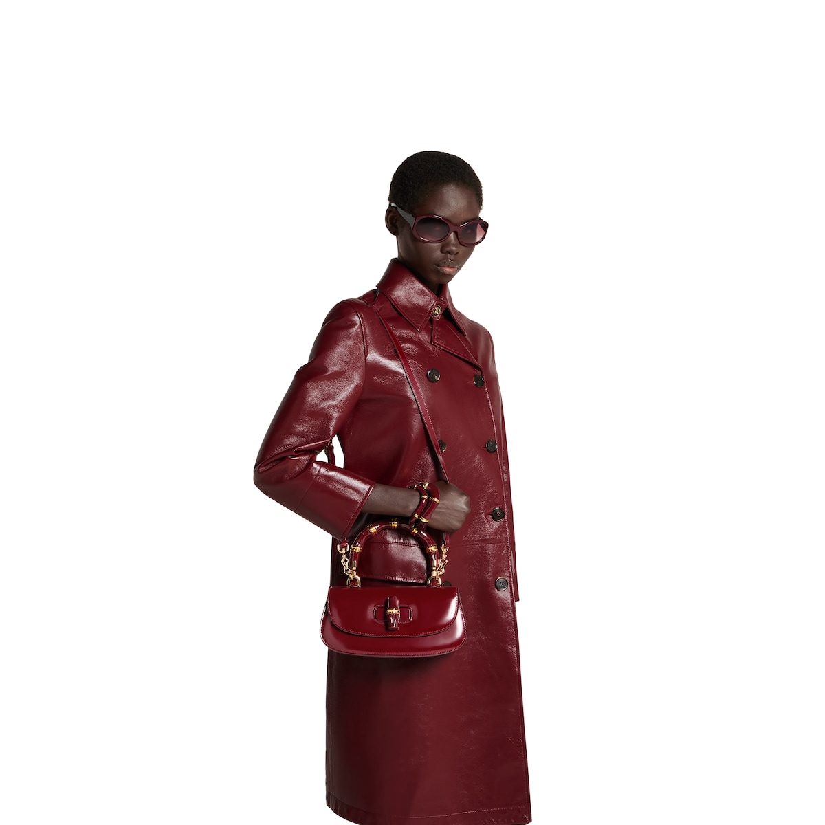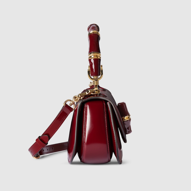 In the Spring Summer 2025 collection, this small top handle bag reinterprets the signature bamboo hardware with resin and brass details. Gucci Bamboo Diva is the starring feature for any look.