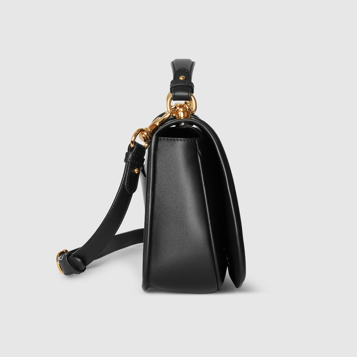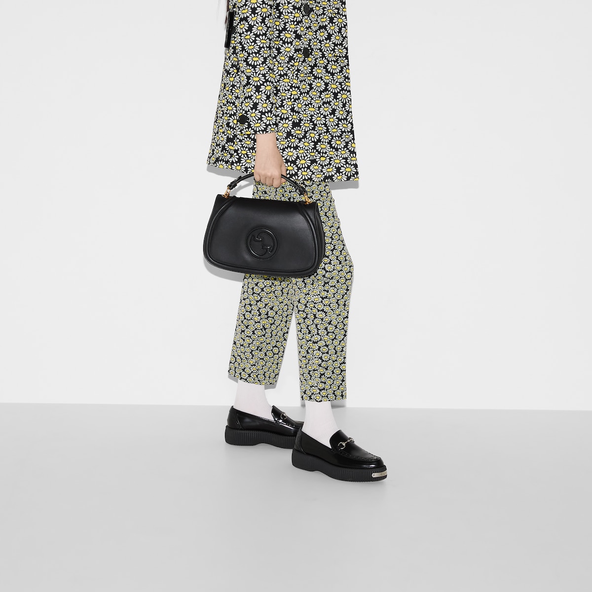 The new Gucci Blondie bag, whose distinctive logo first appeared in the House’s collections in the early 1970s, weaves together past and present in a fusion of nostalgia and modernity. This medium top handle bag with a detachable and adjustable leather shoulder strap is crafted from black smooth leather.