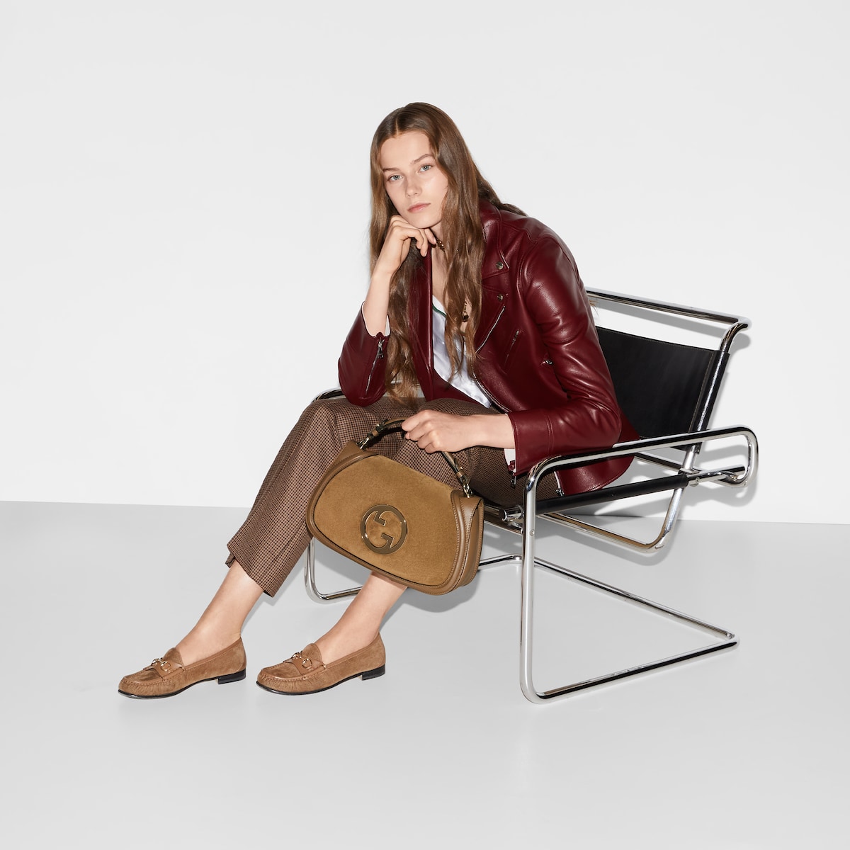 The new Gucci Blondie bag, whose distinctive logo first appeared in the House’s collections in the early 1970s, weaves together past and present in a fusion of nostalgia and modernity. This medium top handle bag is crafted from brown suede, featuring the House’s round symbol in enamel. The style is complete with a leather top handle and detachable, adjustable shoulder strap.