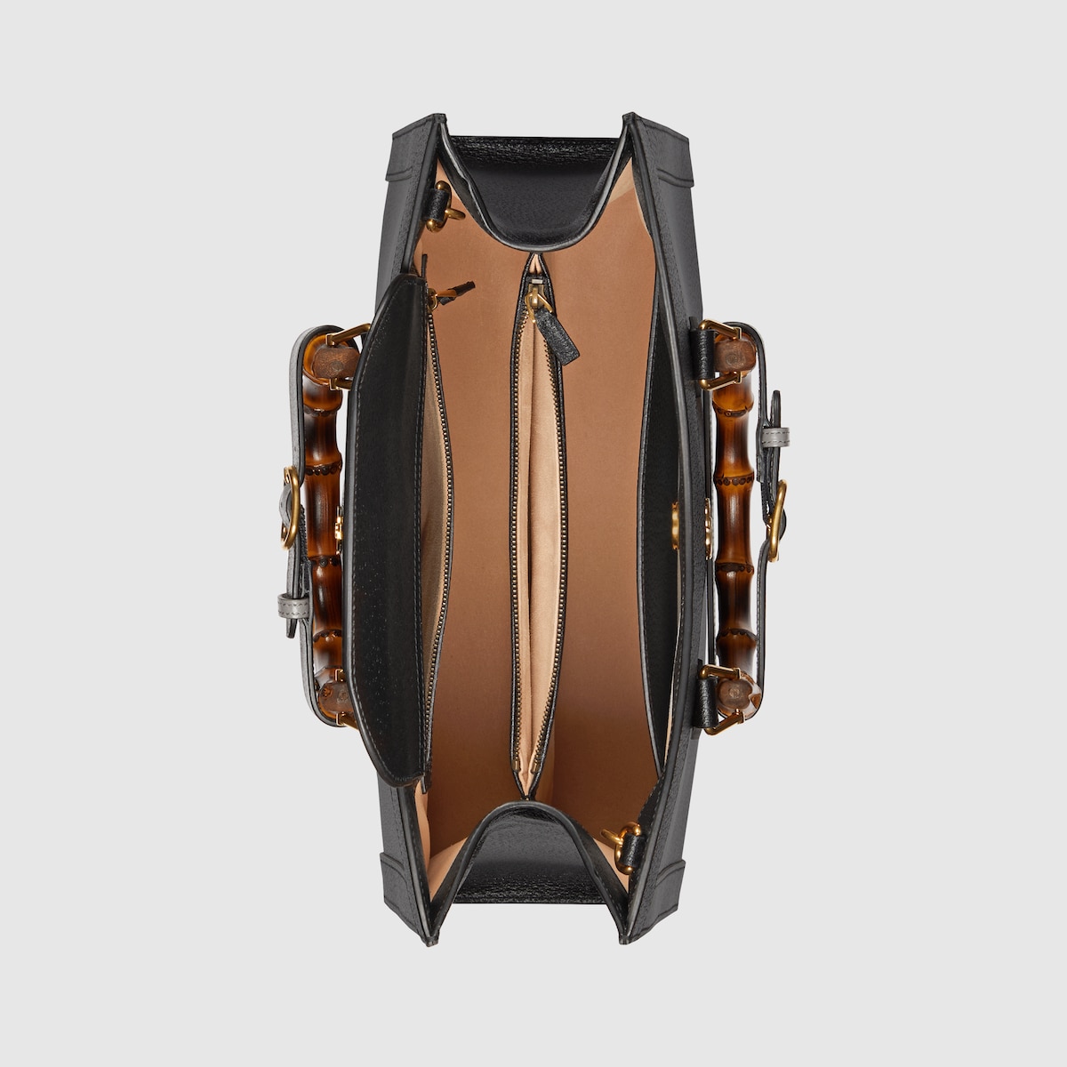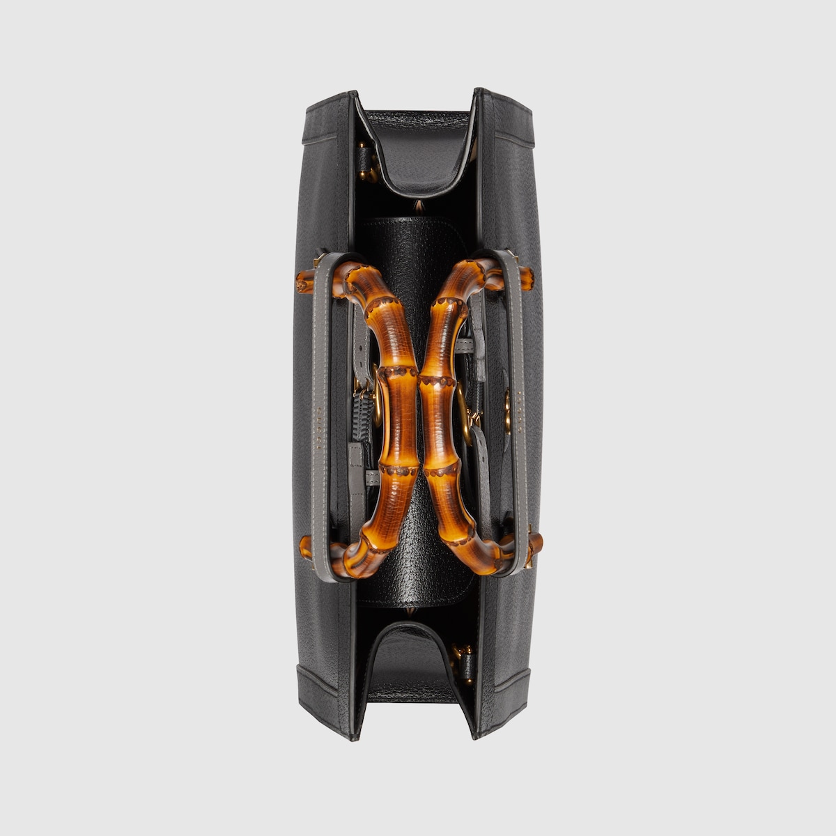 First used in the post-war era when traditional materials were hard to come by, bamboo has become not only a symbol of the spirit of reinvention that runs throughout the House’s designs but one of Gucci’s most recognizable signatures. The Gucci Diana embodies this idea, representing the notion of style in constant evolution with its removable leather belts—a nod to the functional bands used to keep the handles in shape. Here, the bag is presented in black leather.