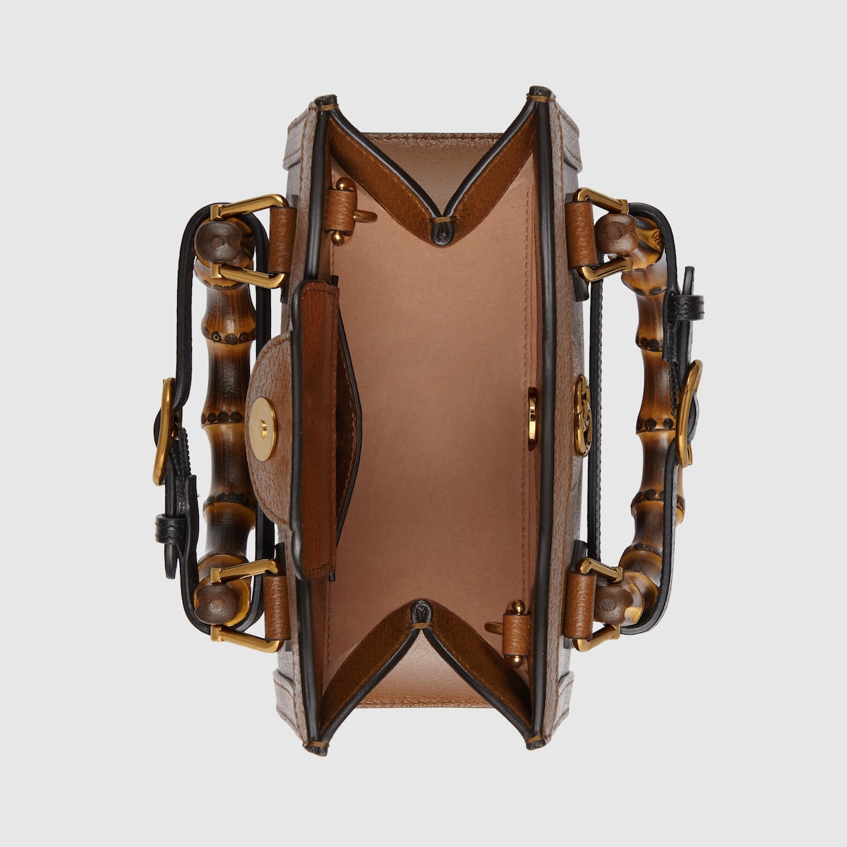 An evolution of a bamboo handle tote first introduced in 1991, the Gucci Diana represents the notion of style in constant evolution and is reimagined with removable, neon leather belts—a nod to the functional bands used to keep the handles in shape. Here, a mini version of the emblematic style is presented in cuir leather.