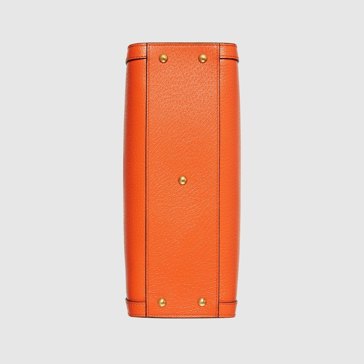 Combining recognizable elements of the House, the Gucci Diana is defined by its bamboo handles and Double G hardware. Crafted from orange leather, the small-sized tote bag is further accentuated by two colored bands, a playful reference to the bands used to keep handles in shape.